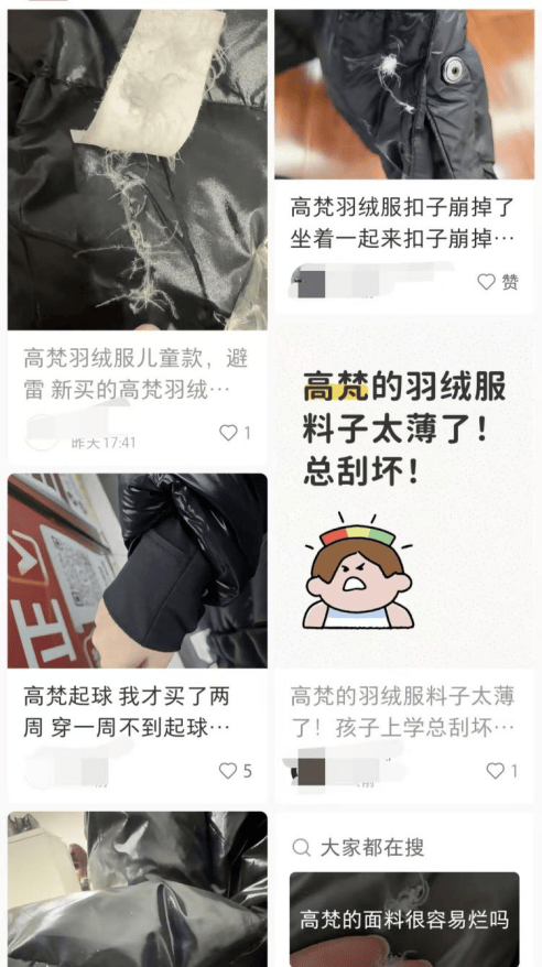在渠道布局上,高梵深度拥抱新型电商模式。根据品牌披露的数据,2023年仅抖音渠道GMV就接近17亿元;2024年全平台GMV更是突破50亿元,其中抖音渠道贡献了约40%,天猫渠道占比超过30%。 资本市场对高梵的追捧同样热烈。据行业消息,2022年至2024年间,高梵已连续完成多轮融资,投资方包括多家知名消费基金和产业资本。 日前,有媒体报道称,高梵已完成新一轮融资,投资方为雷军旗下顺为资本。对此,高梵方面目前暂未做出任何回应。 “某些部位没填充物,客服让我里面多穿点” 快速增长的高梵在今年冬季销售旺季遭遇了前所未有的挑战。从11月初开始,社交媒体上关于高梵羽绒服质量问题的投诉呈现集中爆发的态势。 消费者的不满主要集中在几个方面:羽绒填充不均匀导致保暖性能大打折扣;面料透气性不足导致穿着闷热;部分产品存在线头外露、拉链卡顿等工艺问题;面料太薄容易刮坏等问题。最令消费者愤怒的是,这些质量问题普遍出现在定价2000元左右的中高端产品线上。