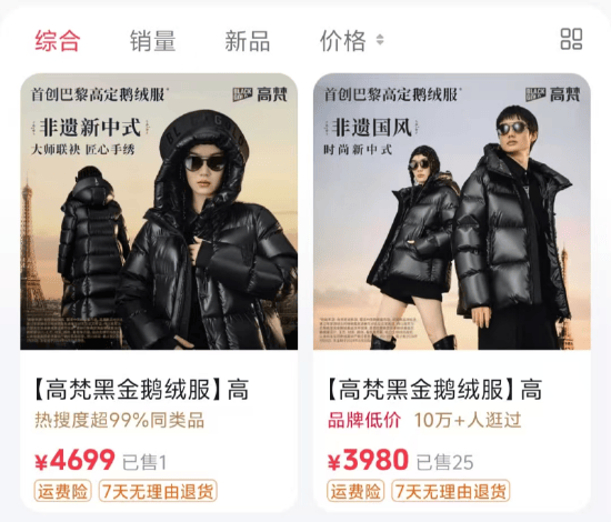 吴昆明“2025年再提价”成空谈? 高梵的高端化战略似乎正在放慢脚步。 从2023年秋冬以来,高梵不断活跃于高奢交流场合:先是在北京华贸SKP中心广场开出国内首家限时精品店;再亮相巴黎时装周,成为首个登陆巴黎时装周官方事件的中国鹅绒服品牌;随后更进驻了巴黎的高端百货莎玛丽丹,并在米兰设立了继上海和巴黎之后的第三个奢研中心。2024年12月,吴昆明还专门飞往匈牙利,筹划建立“飞天鹅绒”专属基地。 2025年年初,高梵创始人兼董事长吴昆明透露,将上探价格带并拓宽客户群体,产品也会有翻天覆地的变化,“2025年高梵还将推出3000元到5000元专门面向男性用户的产品。”他还表示,“占领线下一线高奢商场,是我们2025年的一大任务。”“2025年将再提价。” 然而,从高梵进入今年秋冬以来的动作来看,其高端化或遇现实阻力,相关动作正在放缓。 《BUG》栏目在高梵的线上渠道中观察发现,1300元至2000元价格带的产品仍是其绝对销售主力。截至发稿,其天猫官方旗舰店销量前十的商品中,有七款定价在此区间;而在其抖音官方旗舰店,销量前十的产品则全部位于这一价位区间。 与此同时,品牌尝试向更高价位段的突破却反响平淡。例如,其线上售价最高的一款“黑金鹅绒服巴黎高定4.0七格羽绒服”(目前售价4699元),在天猫旗舰店仅售出不足150件,在抖音官方旗舰店的销量更是仅为1件。这一数据清晰地显示出,目前市场对高梵高端产品的接受度依然有限。