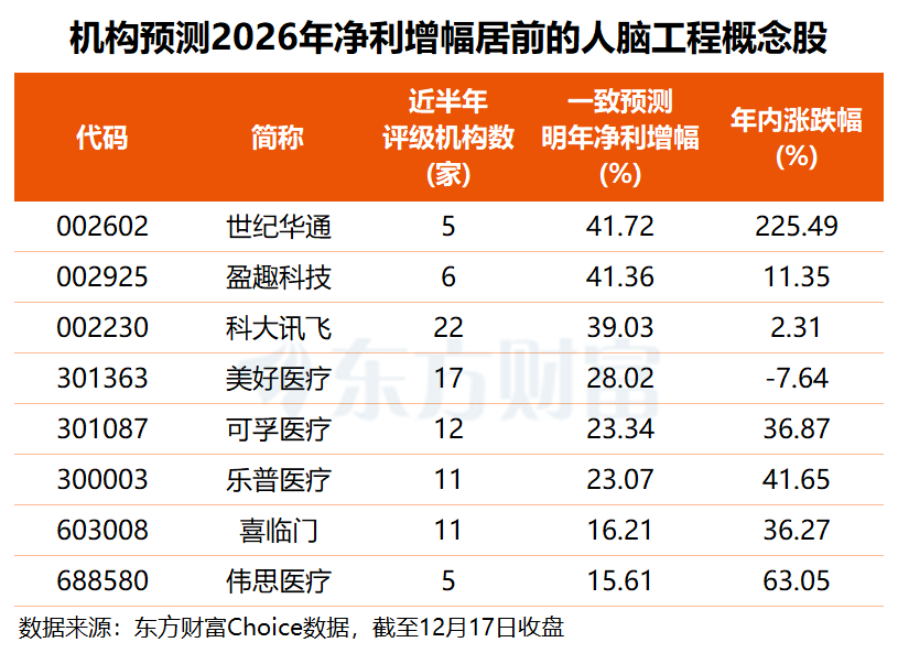 技术与临床频获突破 据科技日报消息,12月17日,中国科学院脑科学与智能技术卓越创新中心发布在侵入式脑机接口领域取得的新突破。研究团队采用高通量无线侵入式脑机接口系统(WRS01),使一位高位截瘫患者能够通过脑电信号稳定操控智能轮椅与机器狗,在真实生活场景中实现自主移动与物品取用。 该研究在关键技术层面取得了系列突破,实现了在噪声环境下仍能高效提取有效信号,将脑控性能整体提升15%至20%;克服了真实环境中声、光、电磁干扰及患者生理、心理状态波动导致的信号不稳定问题;通过自定义通信协议,将系统从信号采集到指令执行的端到端延迟压缩至100毫秒以内,低于人体自然神经环路传导200毫秒的生理延迟水平,使患者的控制体验更为流畅自然。 近日,我国首例执行政府指导价脑机接口手术在湖北武汉实施,31岁的脊髓损伤患者小刘(化名)通过手术完成侵入式脑机接口设备植入,标志着植入式脑机接口技术正式被纳入规范化医疗服务体系。 此外,基于上海研发的脑机接口系统NEO,全球首个植入式脑机接口多中心注册临床试验也取得显著成果。78天内,有32位颈部脊髓受损患者在全国11家医院完成植入手术,术后无器械相关不良反应,受试者累计安全植入近5000天。这一临床试验的成功,初步验证了硬膜外微创植入路径的安全性及长期使用可行性。 多地加强产业支持 今年以来,脑机接口领域政策利好不断,各地持续加码,致力于推动产业加速发展。 近日,《上海市全面深化药品医疗器械监管改革促进医药产业高质量发展的若干措施》正式印发,其中多次提及“脑机接口”。文件指出,要聚焦细胞与基因治疗、脑机接口等重点领域和产品,建立在研重点品种服务清单,在临床试验、注册上市、检查检验、生产许可等环节跨前指导;推进人工智能医疗器械、脑机接口等前沿技术的标准化研究。 上海闵行区发布《关于打造脑机接口未来产业生态的若干意见》提出,支持脑机接口企业梯度培育、支持脑机接口创新医疗器械产品研发注册及生产等10条举措,对在脑机接口领域开展研发创新、推动技术转化及产业协同的企业,按项目投资额情况,给予最高2000万元补贴。 北京市科委、中关村管委会此前发文称,计划设立脑机接口专项孵化基金,打造中关村脑机接口产业集聚区;武汉东湖高新区出台“脑机接口11条”,围绕加强技术产品攻关、推动技术成果应用等五方面,加快发展培育脑机接口产业。 在国家层面,工信部等七部门联合发布《关于推动脑机接口产业创新发展的实施意见》。其中提出,到2027年,我国脑机接口关键技术将取得突破,初步建立先进的技术体系、产业体系和标准体系。脑机接口产品加快应用,产业规模不断壮大,打造2至3个产业发展集聚区,开拓一批新场景、新模式、新业态。 机构:脑机接口行业前景可期 “现阶段,脑机接口主要应用于医疗健康、工业制造、生活消费等领域。”中国电子技术标准化研究院技术总监余云涛表示,随着与人工智能、生物数字、增强现实等新兴领域的交叉融合与创新应用,脑机接口技术和产业的发展前景将十分广阔。 ![]() (来源:中邮证券研报) 公开数据显示,2024年中国脑机接口市场规模为32.0亿元,预计到2028年将达61.4亿元。另据Precedence Research数据,2024年全球脑机接口市场规模约为26.2亿美元,预计2025年将达到29.4亿美元,到2034年有望增长至124亿美元,十年间复合年增长率为17.35%。 西南证券认为,从技术、市场、中美进程对比分析上来看,政策及技术双轮驱动,脑机接口行业大有可为。 国泰海通指出,伴随技术创新突破、政策支持引导、资本投入等多重因素驱动,脑机接口行业有望迎来重要发展机遇,有望在医疗健康、生活消费等下游市场迎来需求释放,市场前景可期。 这些概念股业绩有望显著增长 东方财富概念板块显示,目前A股市场共有39股涉及人脑工程概念,合计总市值约6245亿元,世纪华通、科大讯飞两家公司总市值均超千亿元。 业绩方面,共有18只人脑工程概念股今年前三季度净利实现正增长(含亏损收窄),其中,岩山科技增幅超3倍,道氏技术、世纪华通、创新医疗净利均实现翻倍增长。 东方财富Choice数据显示,近半年共有10只人脑工程概念股获得5家及以上机构评级。其中,科大讯飞关注度最高,共有22家机构给出投资评级,美好医疗、可孚医疗、乐普医疗等4股的评级机构数均超10家。 盈利预测方面,机构一致预测盈趣科技、科大讯飞等3股2026年净利有望实现40%左右的增长,美好医疗、可孚医疗等3股净利预测增幅在20%至30%之间。 资料显示,美好医疗是人工耳蜗CDMO龙头,中邮证券此前研报指出,人工耳蜗是脑机接口的重要应用方向,也是当前临床应用中最为成功的技术典范之一。公司正与下游脑机接口客户深入开展产品合作,协助客户实现从实验室研发到批量出货的高效商业化转化。“我们认为公司具备脑机接口开发能力,后续有望与下游客户取得更广泛合作。” 盈趣科技此前在互动平台上表示,在脑机接口领域,公司主要与客户InteraXon、厦门北洋瑞恒智慧健康有限公司、天津大学医学部及海河实验室等开展合作,研发脑电波监测感应头带、人工神经康复机器人、脑机疲劳驾驶监测等产品。 ![]()