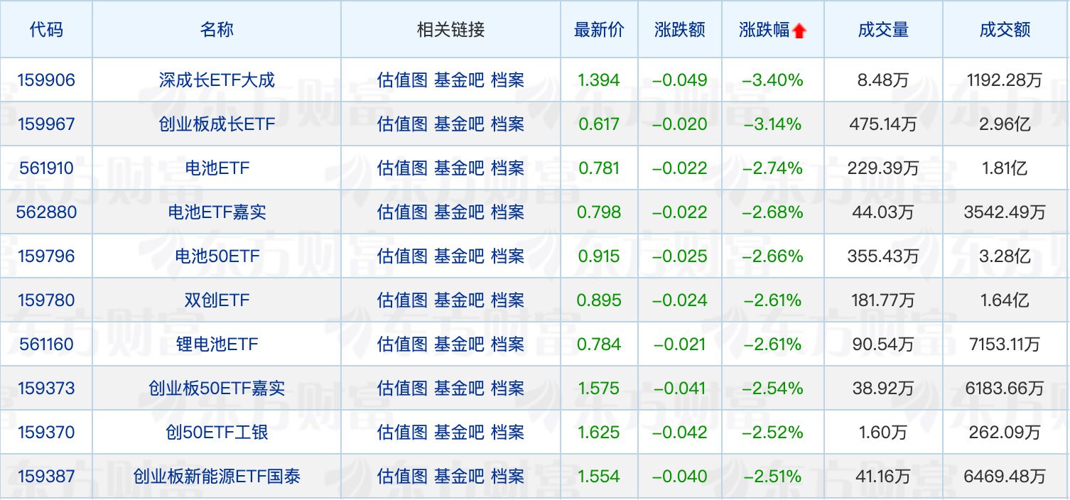 下跌方面,深成长ETF大成、创业板成长ETF跌幅超过3%。锂电池板块回落,海科新源、华盛锂电大跌,多只电池ETF回调居前。