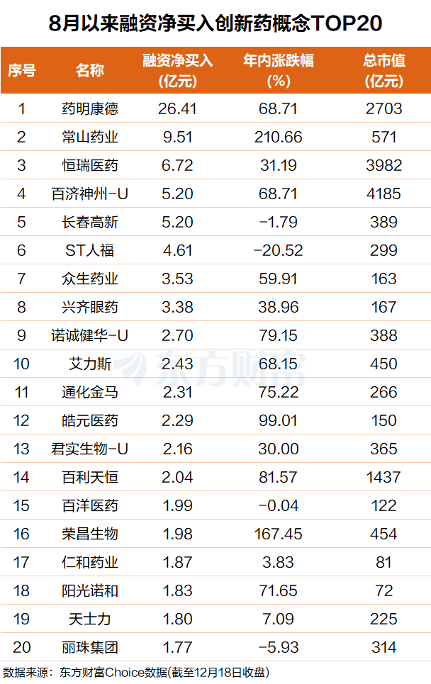 创新药领域有大消息! 据证券时报,北京时间2025年12月18日凌晨,美国参议院官网显示,搭载修订版《生物安全法案》的美国2026财年国防授权法案(2026NDAA)以77票赞成,20票反对结果获得参议院通过,后续将送往白宫,由美国总统签署后立即生效。新版本生物安全法未具体点名任何一家公司,规定后续将由白宫管理和预算办公室(OMB)在法案通过后一年内,参考美国国防部等相关清单,制定受限企业名单。 有券商研究机构认为,2025年法案进展阶段性落地,行业回归中长期增量逻辑。从全球产业链维度,本土CXO(医药研发生产外包服务组织)工程师红利、基础配套设施、快速响应、合规高质量交付及在前沿ADC、多肽等新兴技术领域优势显著,全球范围难找高质量“代餐”,龙头公司具备中长期竞争优势,此前经过2024年生物安全法,2025年关税影响,头部公司药明康德股价短期有所扰动,但从2025年实际订单、经营及股价层面,公司持续交出超预期亮眼表现。建议关注后续名单公布及行业需求持续性下相关公司订单业绩增长延续性。 此外国内消息面上也有利好。据财联社,全国医疗保障工作会议近日在北京召开。会议指出,2026年要积极落地商保创新药品目录,鼓励商业健康保险将更多基本医保目录外的合理医疗费用纳入保障范围;鼓励商业健康保险机构扩大对创新药的投资规模,以促进创新药研发。 杠杆资金:近90亿吸筹这些票 东方财富Choice数据显示,自今年8月以来,杠杆资金抢筹了一批创新药概念股,融资净买额前20个股合计近90亿元。 具体来看,药明康德排名第一,融资净买入超26亿元;常山药业排名第二,融资净买入近10亿元。 恒瑞医药、百济神州、长春高新、ST人福、众生药业、兴齐眼药、诺诚健华、艾力斯、通化金马、皓元医药、君实生物、百利天恒等个股融资净买额在7亿元至2亿元之间不等。 ![]() 机构:行业或开启新一轮景气周期 华泰证券认为,CXO行业外部扰动因素(美国生物安全法案、美国药品关税、新冠药品及疫苗业务高基数、生物医药投融资走弱等)已边际改善,包袱渐轻,情绪渐好。伴随海外降息、国内复苏、叠加产业升级三重驱动,行业已开启新一轮高景气周期。 另外,也有分析人士指出,从CXO的订单和投融资来看,整体景气度明显向上。季度投融资数据、订单、业绩层面均看到顺畅向好传导。与此同时,内需型CRO订单呈现量价齐升趋势。 华泰证券表示,中国CXO核心竞争力仍在(效率、成本、质量、快速扩产能力等),中短期全球地位难以撼动,且大浪淘沙后格局有望逐渐向头部集中。穿越周期,外需型CXO已于2024年下半年陆续走出困境,今年前三季度订单、收入同比双增,在美国降息+新分子订单拉动下有持续提速潜力;内需型CXO经历2023—2024年集中降价后,目前订单端已量增价稳,收入端有望于2026年起陆续迎来曙光。 海通国际表示,仍看好业绩确定性强的互联网医疗、CXO/科研服务龙头,以及已经实现对外合作授权、海外临床进展顺利、基本面强劲的头部Biotech和制药公司。