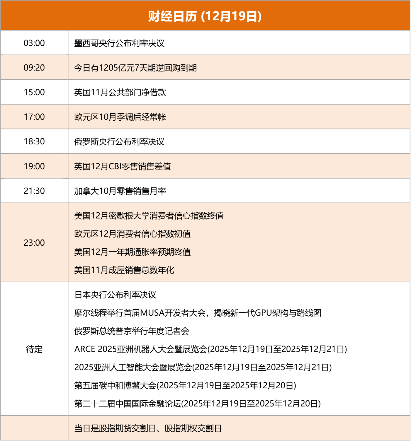 ![]() 每日精选吴清出席会议: 2025年12月18日,中国证监会主席、中国资本市场学会会长吴清出席中国资本市场学会学术委员会成立会议暨第一届第一次全体委员会议,并主持召开资本市场“十五五”规划专家座谈会。吴清表示,证监会将深入学习贯彻党的二十届四中全会和中央经济工作会议精神,扎实推进资本市场“十五五”规划编制和实施,紧扣防风险、强监管、促高质量发展的工作主线,持续深化资本市场投融资综合改革,稳步扩大制度型高水平对外开放,持续提高资本市场制度包容性吸引力,更好服务经济高质量发展和中国式现代化大局。 消费“三新”试点: 近日,商务部办公厅、财政部办公厅印发《关于做好消费新业态新模式新场景试点有关工作的通知》,在北京等50个城市开展消费新业态新模式新场景试点。12月17日,商务部会同财政部召开“三新”试点工作部署推进会。会议强调,各试点城市要进一步完善实施方案,建立健全工作推进和保障机制,抓紧出台试点资金(项目)管理办法,紧扣“三新”试点支持方向,精心筛选支持项目,强化项目动态管理。试点城市商务主管部门要发挥好牵头协调作用,推动解决试点面临的堵点痛点问题,确保试点工作取得实效。 美国CPI数据: 美国11月CPI同比增长2.7%,预估为增长3.1%。美国11月核心CPI同比增长2.6%,预估为增长3%。在11月份消费者价格指数(CPI)公布后,美国联邦基金利率期货显示,美联储1月份降息的可能性从26.6%上升至28.8%。美国利率期货市场定价显示,在CPI数据公布后,预计明年美联储将降息62个基点。 打击涉烟违法活动: 国务院办公厅日前印发《关于全链条打击涉烟违法活动的意见》(以下简称《意见》),提出一系列针对性政策举措,解决烟草制假、售假、走私等突出问题,持续净化烟草市场环境,切实维护国家利益和消费者权益。《意见》强调,各地区各有关部门要高度重视打击涉烟违法活动,全面履行打击涉烟违法活动的属地责任和监管职责,确保打击涉烟违法活动各项工作全链条有机衔接、各项任务措施落地见效。 整治“内卷式”竞争: 近日,市场监管总局党组书记、局长罗文主持召开总局党组扩大会议,传达学习中央经济工作会议精神,研究部署贯彻落实工作。会议要求,要综合整治“内卷式”竞争,推动形成优质优价、良性竞争的市场秩序。要持续优化营商环境,大力激发各类经营主体活力,增强市场内生动力。要持续提升平台经济常态化监管能力,推动平台经济创新和健康发展。 外交部回应: 18日,外交部发言人郭嘉昆主持例行记者会。有记者问,美方宣布对台出售价值约110亿美元的军品,请问发言人有何回应?郭嘉昆表示,美方公然宣布巨额售台先进武器计划,严重违反一个中国原则和中美三个联合公报,严重损害中国主权安全和领土完整,严重破坏台海和平稳定。中方对此坚决反对强烈谴责。 稀土出口管制: 在18日下午召开的商务部例行新闻发布会上,新闻发言人何亚东针对稀土相关物项出口管制的最新进展进行回应。商务部新闻发言人何亚东表示,对稀土相关物项实施出口管制以来,中方主管部门向中国出口商进行了政策宣介,随着相关出口和合规经验的积累,部分中国出口商已初步达到申请通用许可的基本要求。据我所知,目前已收到并批准了部分中国出口商提交的通用许可申请。 商务部回应: 在商务部18日举行的例行新闻发布会上,有记者问,近期,欧委会利用《外国补贴条例》(FSR)工具,连续对同方威视等多家中国企业进行调查。请问中方有何评论?商务部新闻发言人何亚东12月18日说,中方注意到,欧委会近期密集对中国企业发起《外国补贴条例》(FSR)调查,先后对中车集团、同方威视发起深入调查,甚至对中国数字平台进行现场突袭检查,做法恶劣,指向性和歧视性明显。中方对此强烈反对。 中欧电动汽车谈判: 在商务部18日举行的例行新闻发布会上,有记者问,能否介绍下中国与欧盟就电动汽车关税和最低价格方案谈判的最新进展情况?商务部新闻发言人何亚东18日说,中欧双方正在就电动汽车案开展磋商。中方的原则和立场是一贯的,愿与欧方通过对话磋商妥善解决分歧,推进达成行业整体解决方案。 热点题材犒赏经济: 《学习时报》周三发表文章《何为“犒赏经济”》称,当前,我国经济发展从高速发展阶段转向高质量发展阶段,人民对美好生活的向往总体上已经从“有没有”转向“好不好”,消费结构持续优化,服务消费需求持续释放,发展和享受型消费增势显著。在这一背景下,一种被称为“犒赏经济”的新型消费模式在年轻群体中悄然兴起并迅速发展,成为拉动内需、扩大消费的新引擎。 AI医疗: 据报道,蚂蚁集团旗下AI健康应用“蚂蚁阿福”于12月15号发布后下载量猛增,于16日当天冲上苹果应用榜总榜第三位。据悉,“蚂蚁阿福”App月活用户规模已超1500万,每天回答用户500多万个健康提问。 芯片: 摩根士丹利发布最新研报称,在史无前例的人工智能(AI)基建热潮以及传统模拟芯片/MCU(微控制器)强劲去库存步伐推动之下,芯片股的“长期牛市逻辑”仍然完好无损,明年芯片股仍有可能是美股市场表现最亮眼板块之一。 3D打印: 记者从西安交通大学航空发动机研究院获悉:由中国科学院工程热物理研究所等联合研发,陕西企业西安空天机电智能制造有限公司承制的全3D打印涡扇发动机已完成地面试
