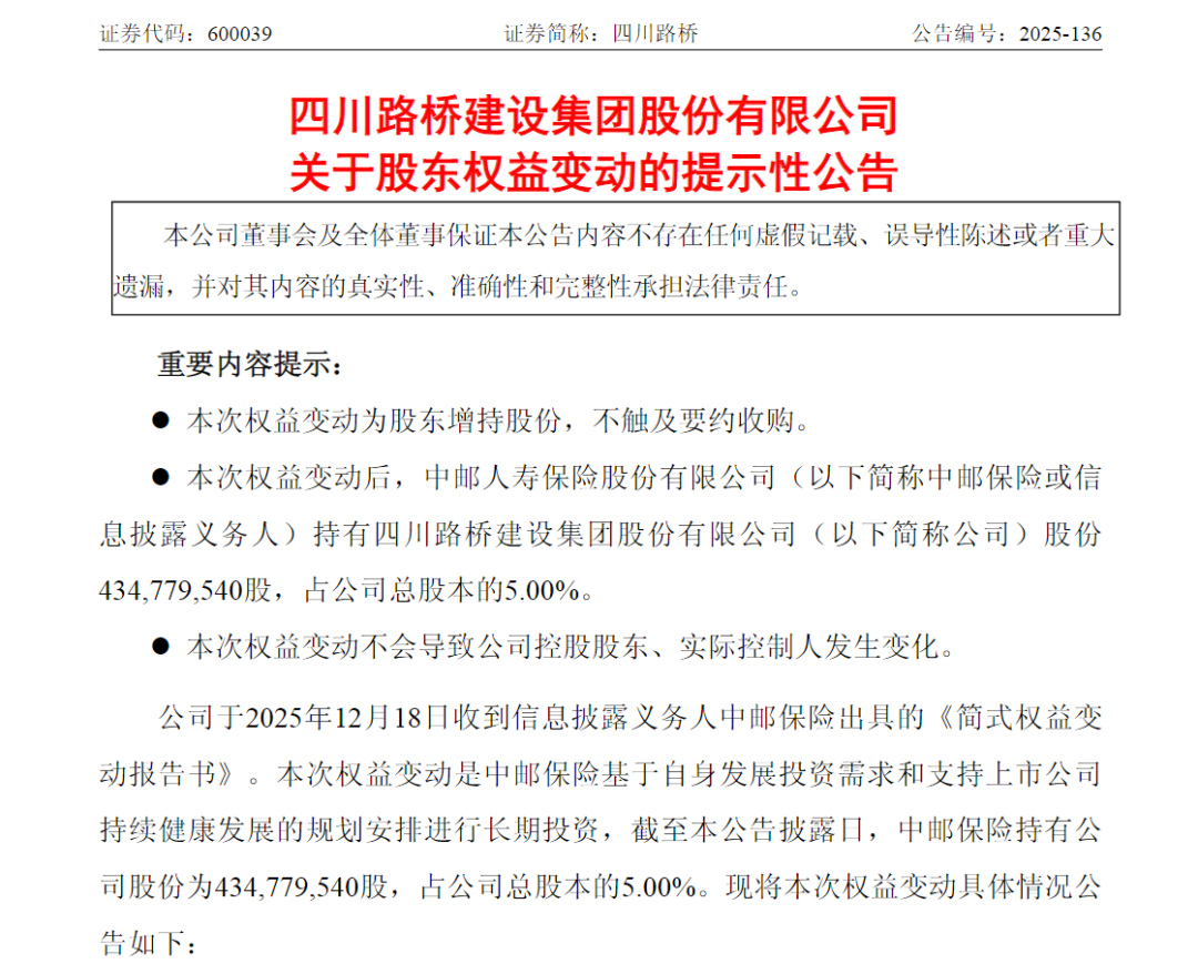 在丁冬财经看资讯行情,选丁冬财经证券一站式开户交易>> 12月18日晚间,四川路桥(600039)发布公告称,中邮保险于2025年12月17日通过二级市场买入股票的方式增持公司11.43万股,占公司总股本的0.0013%。增持后,中邮保险持有四川路桥4.35亿股,占公司总股本的5.00%。此次权益变动不触及要约收购,且不会导致公司控股股东、实际控制人发生变化。 ![]() 业绩表现或为险资举牌原因之一 据披露,对于此次变动,中邮保险是基于自身发展投资需求和支持上市公司持续健康发展的规划安排进行长期投资。 公开信息显示,四川路桥主要从事工程建设、矿业及新材料、清洁能源等产业的投资、开发、建设和运营业务。工程建设板块,业务覆盖公路、铁路、市政、房建、港航等“大土木”领域,具备投融资、设计、建设、运营、养护全产业链一体化发展能力。 今年以来,四川路桥整体业绩表现良好。财报显示,今年前三季度,四川路桥实现营收732.81亿元,同比增长1.95%;归母净利润53.00亿元,同比增长11.04%;单三季度归母净利润25.20亿元,同比增长59.72%。 公司半年报披露,报告期内,其发布2024年度利润分配方案,现金分红32.84亿元,2024年度累计分红金额占当年归属于上市公司股东净利润的50.02%。2025年2月,公司发布《四川路桥未来三年(2025年度-2027年度)股东回报规划》,规划期内每一年度以现金方式分配的利润不低于当年度归属于上市公司股东净利润的60%。同时公司将再次实施中期分红,2025年中期预计派发现金红利2.78亿元,积极分享经营成果,回报投资者。 险资举牌上市公司年内已近40次 值得注意的是,险资举牌今年持续升温。据不完全统计,年内险资举牌接近40次,创2016年以来新高。其中,险资对H股公司举牌次数超30次。 在此次举牌四川路桥之前,中邮保险年内已进行过三次举牌。分别是东航物流(601156.SH)、绿色动力环保(01330.HK)和中国通号(03969.HK),涉及基建、环保和交通板块。 中邮保险有关负责人此前曾表示,展望“十五五”,险资需在长期资本入市、科技攻关、城市更新、养老保障等领域当好“稳定器”。中邮保险将从锻造跨资产、跨周期主动管理能力;健全长期资本运作机制;聚焦国家急需领域深化布局;塑造“稳健透明、专业可信”的长期资本品牌等四方面持续发力。 除中邮保险外,还包括平安人寿年内举牌了招商银行H股、邮储银行H股、农业银行H股等,长城人寿举牌了秦港股份、中国水务H股、大唐新能源H股,新华保险举牌了北京控股H股等。 大公国际分析称,国家金融监督管理总局于12月5日发布《关于调整保险公司相关业务风险因子的通知》对保险公司提升资本使用效率、优化资产配置结构、支持外贸等方面均产生了重要影响。风险因子的调整使得保险资金能够更好地发挥耐心资本作用,有效服务国家战略。 全新妙想投研助理,立即体验 (文章来源:上海证券报) |