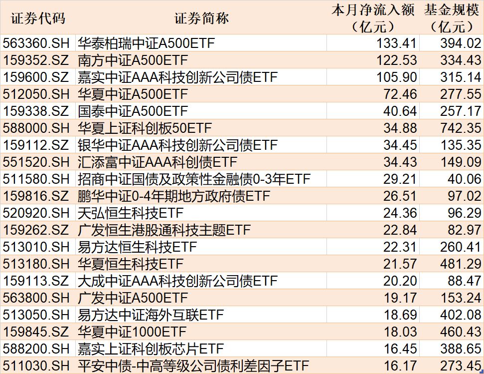 与此同时,富国中证军工龙头ETF基金份额减少8.75亿份,净流出额6.12亿元;鹏扬中债-30年期国债ETF份额减少0.05亿份,净流出额5.39亿元;博时中证可转债及可交换债券ETF份额减少0.28亿份,净流出额3.74亿元。 截至12月18日,本月资金净流入额居前20的ETF名单如下: