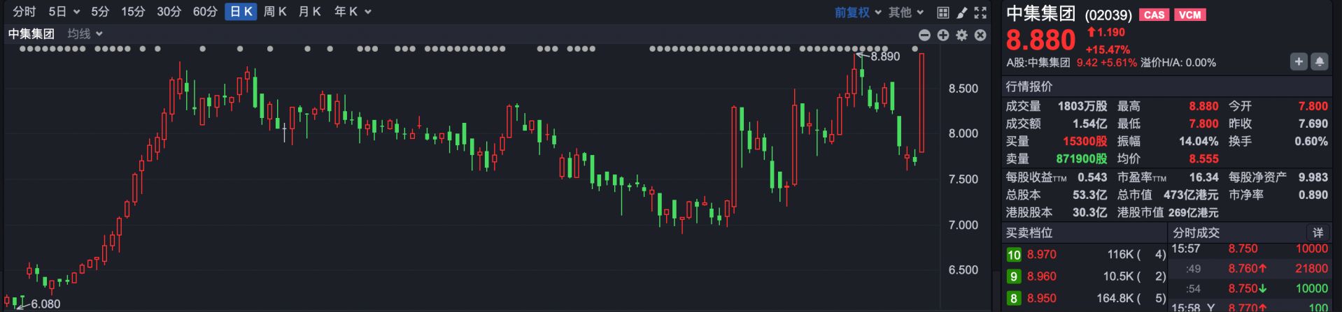 焦点公司方面,中集集团H股(HK02039)尾盘拉升,最终报收于8.88港元,全天涨幅超过15%。 消息面,中集集团昨晚发布公告,公司召开第十一届董事会2025年度第16次会议,审议通过了《关于使用一般性授权回购部分H股股份(第二批)方案的议案》,同意公司继续使用H股回购一般性授权,新增港币3亿元(含)用于第二批H股回购。
