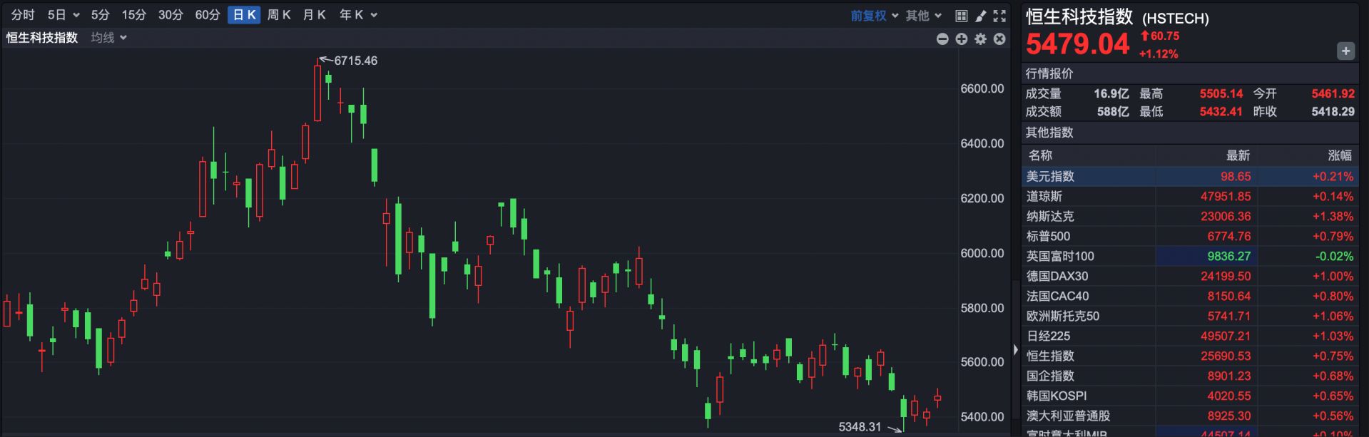 恒生科技指数报收于5479.04点,上涨60.75点,涨幅1.12%。