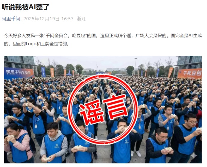 今日,一张所谓“阿里千问全员会吃豆包”的图片在社交平台流传,引起网友热议。对此,阿里千问官微发文回应称:“广场大会是假的,图完全是AI生成的,里面的Logo和工牌全是错的。”