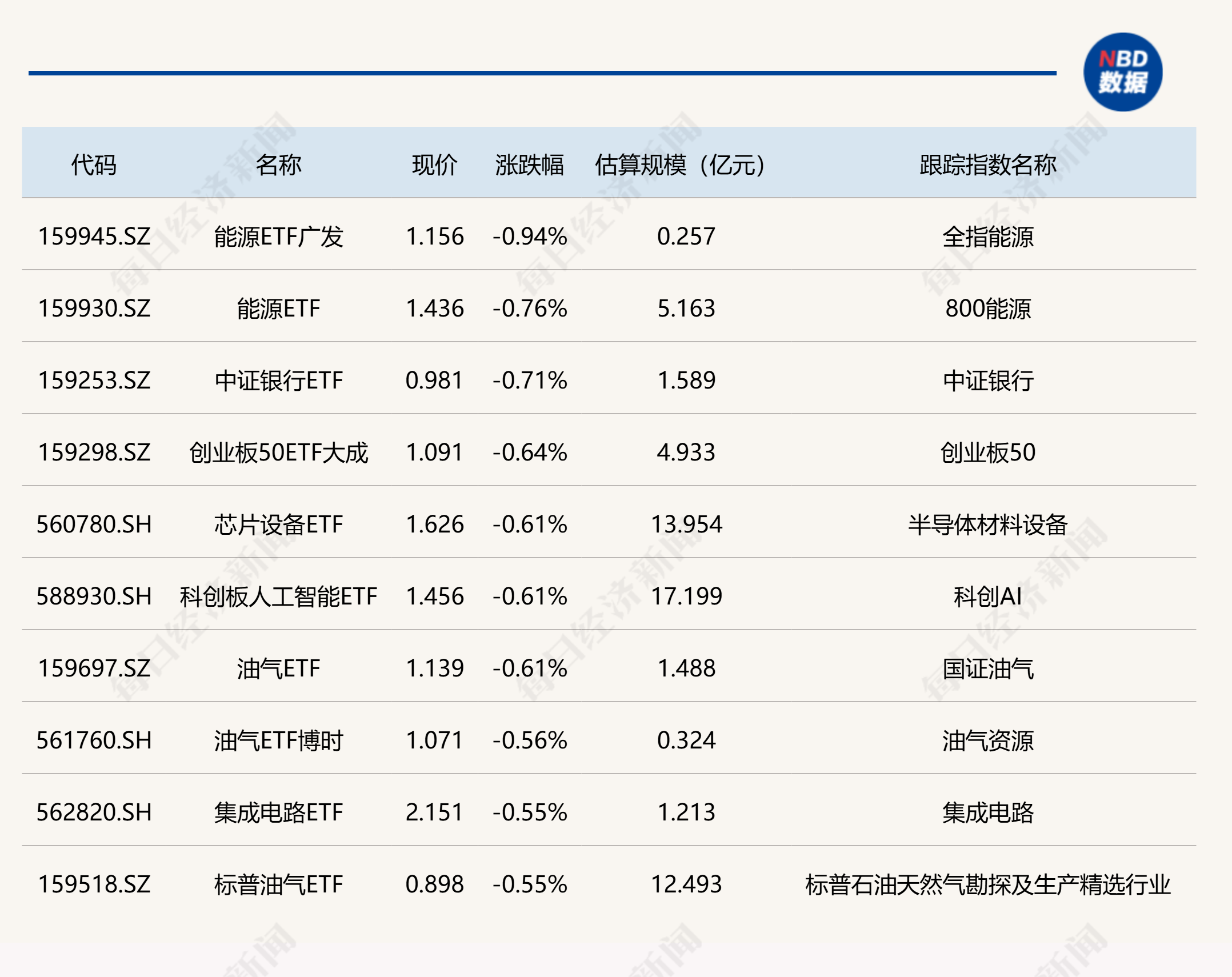 有券商表示,随着智能化技术的加速落地,部分车企凭借领先的智能驾驶与智能座舱技术,正处于新品周期与技术周期的共振阶段,有望推动销量持续增长。同时,政策对汽车消费的持续支持,以及新能源汽车渗透率的不断提升,为整车企业提供了广阔的市场空间。 下跌方面,能源相关ETF跌幅居前。