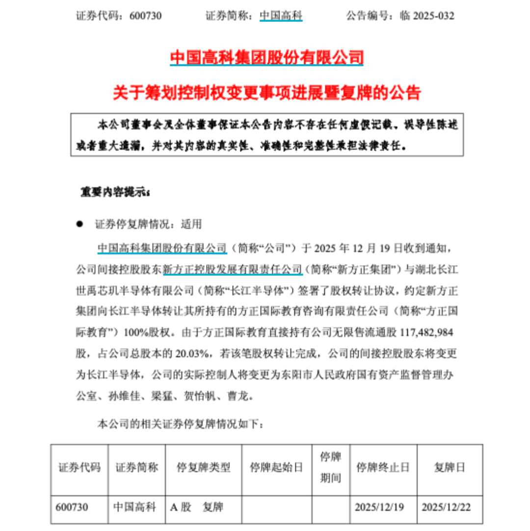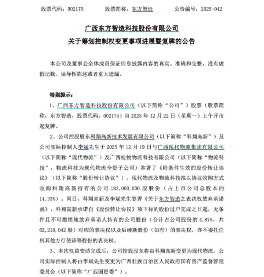 两只A股公司迎来国资入局。 12月19日晚间,东方智造(002175)、中国高科(600730)均发布了《关于筹划控制权变更事项进展暨复牌的公告》,公告显示,两家公司或分别迎来地方国资入局,公司股票均将自下周一(12月22日)上午开市起复牌。 东方智造公告显示,公司控股股东科翔高新技术发展有限公司(以下简称“科翔高新”)及公司实际控制人李斌先生于2025年12月19日与广西现代物流集团有限公司(以下简称“现代物流”)及广西桂物物流科技有限公司(以下简称“物流科技”,物流科技为现代物流全资子公司)签署了《附条件生效的股份转让协议》(以下简称“股份转让协议”),现代物流及物流科技拟以协议收购方式收购科翔高新持有的公司1.83亿股股份(占上市公司总股本的14.33%)。同日,科翔高新及李斌先生签署《关于东方智造之表决权放弃承诺函》,科翔高新承诺自《股份转让协议》项下标的股份过户完成之日起,无条件且不可撤销地放弃承诺人持有的公司股份(合计占公司股份的4.87%,共约6221万股)对应的表决权以及后续新股份(如有)的表决权,亦不委托任何其他方行使该等股份的表决权。 公告称,本次权益变动完成后,公司控股股东将由科翔高新变更为现代物流,公司实际控制人将由李斌先生变更为广西壮族自治区人民政府国有资产监督管理委员会。 ![]() 同日,中国高科也发布公告称,公司于2025年12月19日收到通知,公司间接控股股东新方正控股发展有限责任公司(简称“新方正集团”)与湖北长江世禹芯玑半导体有限公司(简称“长江半导体”)签署了股权转让协议,约定新方正集团向长江半导体转让其所持有的方正国际教育咨询有限责任公司(简称“方正国际教育”)100%股权。由于方正国际教育直接持有公司无限售流通股约1.17亿股,占公司总股本的20.03%,若该笔股权转让完成,公司的间接控股股东将变更为长江半导体,公司的实际控制人将变更为东阳市人民政府国有资产监督管理办公室、孙维佳、梁猛、贺怡帆、曹龙。 ![]()