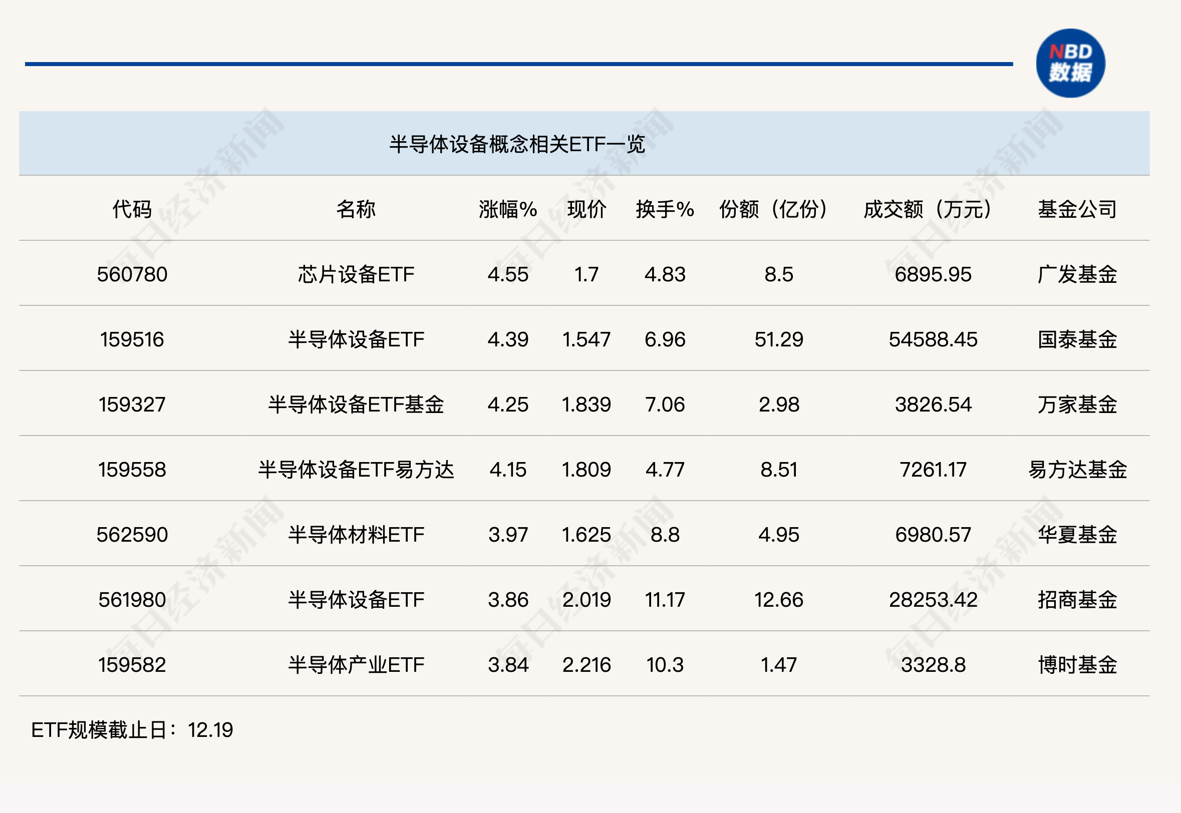ETF涨幅榜方面,半导体产业链大爆发,包括芯片设备ETF(560780)等四只半导体材料设备ETF半日涨幅均超过4%。