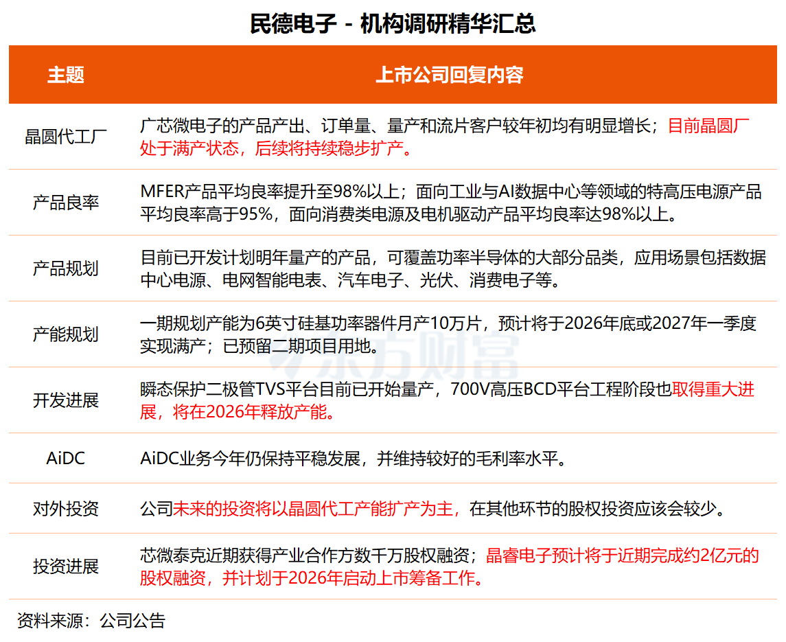 民德电子:目前晶圆厂处于满产状态 后续将持续稳步扩产 民德电子近日接受大成基金、国信证券等近30家机构调研,公司在交流中透露,功率半导体晶圆代工厂——广芯微电子处于良性扩产中,产品产出从年初的6000片/月提升到年底的4万片/月,订单量从年初1万片/月提升到11月的4万片以上,量产和流片客户从年初的6家增至目前的十多家,且还有几家新客户在陆续接洽和导入。“目前晶圆厂处于满产状态,后续将持续稳步扩产。” 关于未来的产能规划,民德电子表示,广芯微电子一期规划产能为6英寸硅基功率器件月产10万片,预计将于2026年底或2027年一季度实现满产,同时已预留二期项目用地。 “广芯微电子目前代工生产的车规级产品主要应用在非电驱类方面,例如车窗升降器、车辆转向装置、车灯驱动电路等领域。”民德电子表示,该公司目前已开发计划明年量产的产品包括高压BCD、TVS、IGBT等产品,可覆盖功率半导体的大部分品类,应用场景包括数据中心电源、电网智能电表、矿机电源、汽车电子、光伏、消费电子等。 对外投资方面,民德电子表示,公司未来的投资,将以晶圆代工产能扩产为主,在其他环节的股权投资应该会较少。此外,对于此前已投资的非核心资产,会考虑在合适的时机出售以收回资金,并获取一定的投资收益。 据其介绍,特种工艺晶圆代工厂芯微泰克于近期获得了产业合作方数千万的股权融资;晶圆原材料企业晶睿电子预计将于近期完成约2亿元股权融资,并计划于2026年启动上市筹备工作。 ![]() 民德电子主要从事AiDC设备的研发、生产和销售业务,以及功率半导体晶圆代工、设计和分销业务。今年前三季度,公司实现营收2.24亿元,同比下降13.71%,归母净利润亏损1120.18万元。 二级市场方面,民德电子股价今日上涨1.29%,本月涨幅为2.62%。
