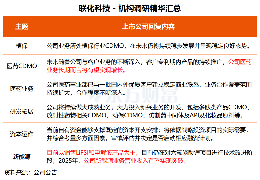 联化科技:今年新能源业务营收有望实现突破 联化科技近日接受国海证券、野村资管等5家机构调研。 在调研中,联化科技表示,公司已与多个国际农化/植保公司开展了以技术创新为驱动的CDMO业务,并达成长期战略合作伙伴关系,合作深度覆盖产品生命周期各个阶段。公司业务所处的植保行业CDMO在未来仍将持续稳步发展并呈现稳定良好的态势。 “目前,公司医药事业部已与一批国内外优质客户建立稳定商业联系,业务合作覆盖范围持续扩大,合作程度不断深入。”联化科技表示,未来随着公司与客户业务的不断深入,客户专利期内产品的持续推广,公司医药业务长期而言将有望实现增长。 据联化科技介绍,今年以来,公司在医药产品技术研发方面持续发力,从传统小分子药物拓展到氨基酸、多肽、PROTAC/ADC连接子、寡核苷酸等。新方向的尝试有望拓展公司医药CDMO业务的服务领域,帮助公司承接更多的项目。 新能源业务方面,联化科技透露,公司目前以销售LiFSI(双氟磺酰亚胺锂)和电解液产品为主,目前仍在对六氟磷酸锂项目进行技术改进阶段。“2025年,公司新能源业务营业收入有望实现突破。后续将继续以个别核心产品深入新能源市场,打通供应链上下游,把技术积累的优势转化为市场优势。” ![]() 联化科技主营业务分为植保、医药、功能化学品和设备与工程服务板块,是全球领先的化学和工程解决方案提供商。今年前三季度,公司实现营收47.18亿元,同比增长8.25%;归母净利润为3.16亿元,同比大增871.65%。 中金公司近日研报指出,随着六氟磷酸锂和LIFSI价格高位落实,公司新能源化学品业务开工率有望上行,盈利有望改善。此外,随着公司医药CDMO业务的持续推进,医药业务也将逐步迎来收获期。 中银证券也表示,公司植保业务高质量发展,医药及功能化学品业务稳步增长,看好公司所处植保行业景气度回暖,以及各业务产品布局有序推进。 二级市场方面,联化科技今日微涨0.08%,近一个月涨幅为4.01%。