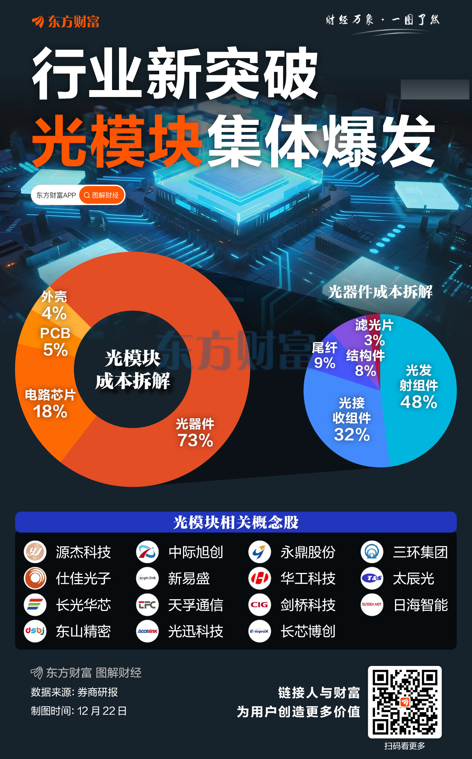 核心部件迎新突破!光模块概念集体走强 专业金融数据,下一代智能终端 ![]() 光模块板块12月22日表现强势,亨通光电、长飞光纤、通宇通讯、杭电股份纷纷涨停;凯格精机、长芯博创、致尚科技大涨超10%。龙头股“易中天”(中际旭创、新易盛、天孚通信)也涨幅明显。 消息面上,据财联社12月22日报道,上海交通大学科研人员近日在新一代光计算芯片领域取得突破,首次实现了支持大规模语义媒体生成模型的全光计算芯片。相关成果12月19日发表于《科学》杂志。 资料显示,光芯片是光模块的核心上游组件,承担光电/电光转换的核心功能,其性能直接决定光模块的速率、功耗与稳定性。东吴证券表示,光芯片可通过加工封装成为光发射组件(TOSA)及光接收组件(ROSA)。 华鑫证券表示,TOSA和ROSA是光器件的重要组成部分,二者合计占光器件的成本约80%。而光器件又是光模块的重要组成部分,占光模块的成本约73%。该机构表示光模块产业链可关注源杰科技、永鼎股份、长光华芯、光迅科技等个股。 随着AI数据中心的快速发展,光模块作为数据中心内部互连和数据中心相互连接的核心部件,正受到市场的猛烈追捧。比如新易盛,该股4月9日盘中触及46.56元阶段低点,而12月22日盘中最高触及466.66元,股价完成了十倍壮举。 展望2026年,兴业证券表示,海外算力有望进入“空中加油”新阶段:从2026年海外算力光模块订单指引、英伟达GPU在手订单以及北美CSP厂商资本开支指引来看,算力基础设施投入节奏仍未放缓,在过去三年高增长基础上有望实现增速提升。光模块及配套产业链或存在预期差,Blackwell推动数据中心进入“加速兑现期”,Rubin进展顺利,1.6T光模块明年有望成为主力需求,龙头公司明年业绩有望维持高增长。 从规模来看,根据LightCounting的预测,全球以太网光模块市场规模有望持续快速增长,2026年将同比增长35%至189亿美元,2027~2030年增速将维持在双位数以上,2030年有望突破350亿美元。 其中800G/1.6T等高速光模块的需求有望逐步占据市场主导地位。LightCounting表示,2026年800G和1.6T光模块将迎来快速放量,预计2030年800G和1.6T以太网光模块的整体市场规模将超过220亿美元。