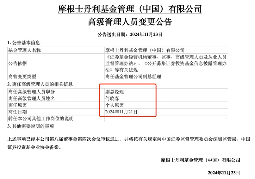 又见基金公司副总经理离任,这一次是外商独资公募。 近日,摩根士丹利副总经理何晓春离任,同时卸任了在管的大摩品质生活精选等5只基金,离任前在管规模为12.33亿元。 当前基金公司副总离任并不罕见,包括黄海、冯明远等多名肩负投研的副总基于专注投研等考虑离任副总,不过,此次何晓春离任同时卸任了所有产品,也给市场增加了几分猜测。 此外,公司也有新高管加入,原华宝基金常务副总经理刘欣已经加盟摩根士丹利基金出任副总,财联社记者获悉,目前刘欣已经入职。今年7月30日,刘欣因个人原因从华宝基金离任。 清仓式卸任,何晓春离任副总经理一职 11月23日,摩根士丹利基金发布高级管理人员变更公告,公司副总经理何晓春因个人原因离任。同日,他卸任了大摩品质生活精选、大摩优享臻选六个月持有、大摩新兴产业、大摩领先优势、大摩优悦安和等5只基金等所有在管产品。 ![]() 何晓春,是一名有24年资本市场经验,十余年投资经验的老将,此前历任世纪证券、金鹰基金,2017年12月加入摩根士丹利基金,历任助理总经理兼权益投资部总监,现任副总经理、权益投资部总监、基金经理、投委会主任委员。 从风格来看,期货背景出身的他风格独特,对波动容忍度较高、较为激进,表现在业绩上,亦有起伏。从他卸任的产品业绩来看,成立较早的大摩品质生活精选、大摩领先优势任期内回报分别达到85.14%、43.36%。成立在2020年至2022年市场高位的产品在任职期内悉数收负。 在2023年,在市场艰难情况下,何晓春发行了新产品大摩优质精选,不过到今年6月,运行约一年后,该基金因连续50个工作日出现基金资产净值低于5000万元情形清盘。 ![]() 随着市场的回暖,何晓春的业绩在近期也有明显修复。以他管理的大摩新兴产业股票来看,近3个月涨幅近40%。 作为行业老将,何晓春有着清晰地产业到个股的选择逻辑。在2023年接受财联社记者采访时,他表示,极致行情要求投资的心理承受能力要越来越强,难免焦虑。他表示,随着宏观经济增速放缓,真正具备价值的资产会相对稀缺。同时,他也认为,如果站在中长期的投资角度则不必过虑,因为中长期仍然会回归到行业和公司的基本面上来。 在摩根士丹利期间,除了日常投研,何晓春还负责公司权益投研团队管理。一方面以投研一体化为核心,发挥人才优势,推动团队互补;另一方面对投资理念的梳理和对投资流程的规范。 何晓春此次清仓式卸任,外界亦有他或将离开摩根士丹利的猜测。在业内看来,临近年末,机构高管、投研变动亦属正常。随着11月接近尾声,或因业绩排名、或因职业规划,基金公司或将有频繁人事变动。 一年之内完成高管团队换新 自2021年6月贝莱德基金就成为了首家获批展业的外商独资基金管理公司之后,已有泰达宏利、路博迈、富达、施罗德基金、摩根资产管理、摩根士丹利、安联基金、联博基金陆续获批,外商独资基金管理公司数量增长至九家。 其中,摩根士丹利基金在2023年2月,继宏利、摩根资产管理之后,成为第三家合资转外资控股获批的公募基金。 相较于新获批的外商独资公募,合资转外资的基金公司在内地展业有一定的基础,也在新业务上积极拓展。比如摩根资产管理全力入局中证A50ETF、中证A500ETF,当前规模均在前列尤其是中证A500ETF规模突破百亿;宏利基金在全球配置、养老领域颇有名气,其中宏利印度QDII备受投资者追捧。 摩根士丹利基金方面,今年在权益产品上也有亮色。截至今年10月底,雷志勇管理的大摩数字经济在偏股混合基金中排名第一,年内收益近58%。不过,从整体业务发展来看,公司稍显锐度不足,外界感知更多的是,高管团队的更迭。 2024年1月2日,副总经理周文秱官宣,他在2023年10月已经到岗,从履历来看,他较长时间在外资保险行业,在摩根士丹利基金负责投资以及国际业务部。 到了4月,摩根士丹利基金总经理王鸿嫔因个人原因离职,这位传奇女将曾掌舵过两家合资公募。周文秱接任了王鸿嫔,与此同时,摩根士丹利投资管理任命了黄敏担任新设的大中华区业务主管,当时摩根士丹利曾表示,大力推动中国投资管理业务。 与此同时,今年3月,公司原副总经理李锦也因个人原因离职;5月16日,公司原督察长许菲菲因个人原因离任,由毛慧接任。毛慧有锦天城、源泰、北京汉坤等多家律所以及申万菱信、永赢基金相关岗位工作经验。 诚然,在合资转外资后,基于股东方的变化,机构都会经历一轮高管的调整与变动。今年以来,包括安联基金、联博基金、贝莱德、富达基金、宏利基金等多家外商独资基金公司高管出现了变更。 一般而言,外资股东方会倾向有过外资经验的人士担任总经理,更直接一点,会选择股东方在大中华区的高管空降,这一角色既需要深刻理解股东的投资理念,又需要对国内本土化熟稔。在总经理变动之后,督察长等职位变动也较为常见,副总的变动则更多是基于业务端的考虑。 在系列高管变动之后,市场也尤为期待摩根士丹利接下来的发展。对于中国市场的前景,周文秱在近期举办的2024年上海证券交易所国际投资者大会上指出,从全球配置角度看,中国资本市场可投资标的广泛且极具多样性,为国际资金提供了独特的投资回报来源。对于资产管理公司而言,中国资产管理行业体量庞大、潜力无限,蕴含着巨大的发展机遇。 而对于摩根士丹利未来的发展路径,周文秱表示,将通过