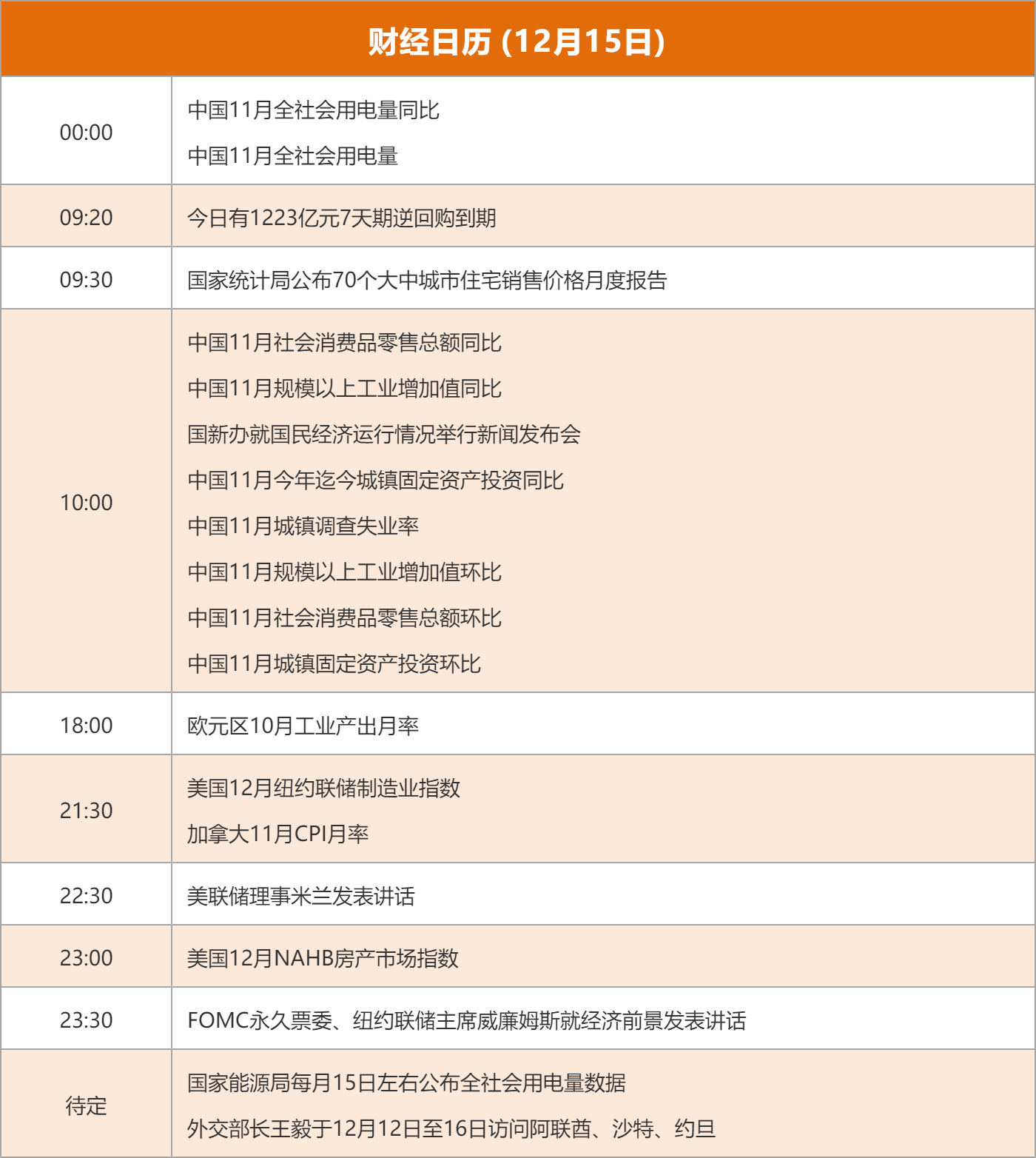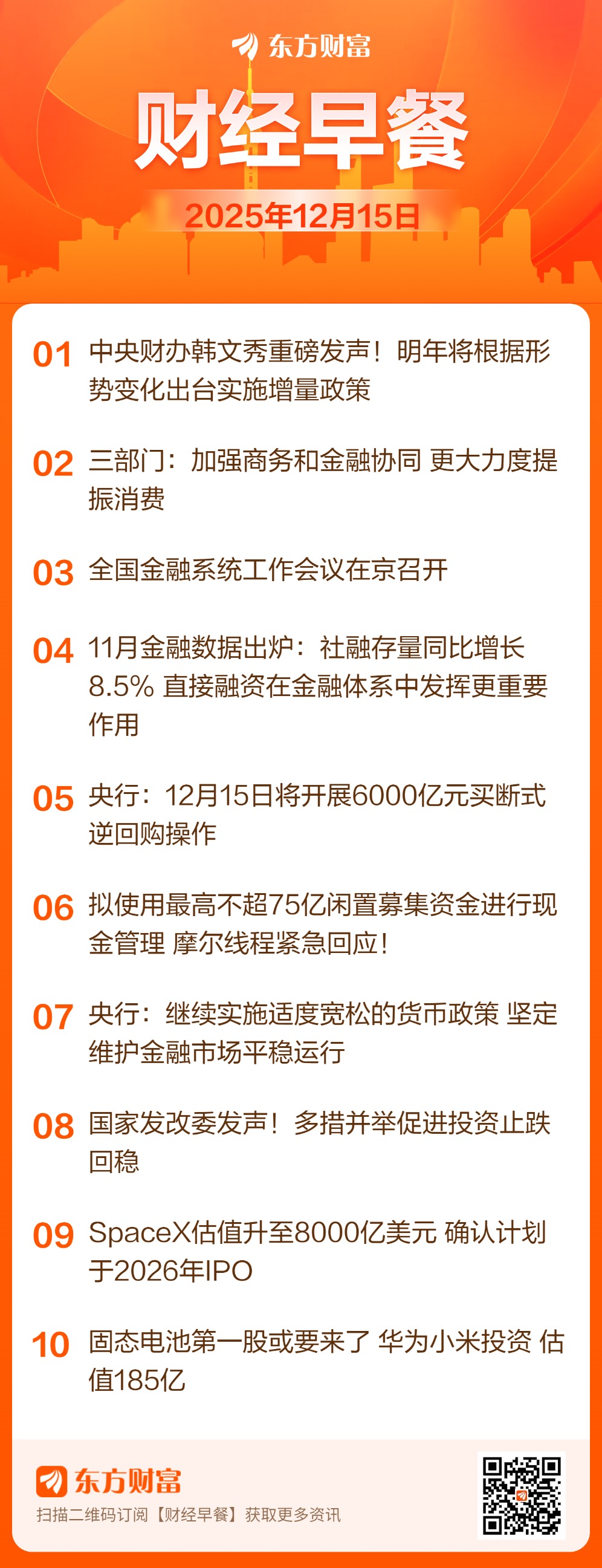 ![]() 每日精选增量政策或将出台: 12月13日,2025—2026中国经济年会在中国国际经济交流中心举办,中央财办分管日常工作的副主任、中央农办主任韩文秀在会上表示,2025年我国主要经济指标表现好于预期,经济总量预计达到140万亿元左右。2026年将根据形势变化出台实施增量政策,要协同发挥存量政策和增量政策集成效应,推动经济稳中向好。 更大力度提振消费: 商务部办公厅等三部门发布关于加强商务和金融协同,更大力度提振消费的通知。其中提到,强化政策合力。鼓励地方商务主管部门充分利用现有资金渠道,积极开展促消费活动,与金融支持形成合力,更好激发消费潜力。鼓励有条件的地方运用数字人民币智能合约红包提升促消费政策实施质效。结合地方实际探索运用融资担保、贷款贴息、风险补偿等多种方式,加强财政、商务、金融政策协同配合,引导信贷资金加大向消费重点领域投放。 全国金融系统工作会议: 全国金融系统工作会议12月12日在京召开。中共中央政治局委员、中央金融委员会办公室主任何立峰出席会议并讲话。他强调,金融系统要深入学习贯彻中央经济工作会议精神,准确把握经济工作面临的形势和主要目标任务,坚定做好金融工作的信心和决心,坚持防风险、强监管、促高质量发展工作主线,有力有序有效做好2026年金融重点工作。继续实施好适度宽松的货币政策,加强对扩大内需、科技创新、中小微企业等重点领域的金融支持,稳步有序推进金融改革开放,做好预期管理。 11月金融数据: 12日,人民银行公布11月金融数据。数据显示,2025年11月末社会融资规模存量为440.07万亿元,同比增长8.5%。其中,对实体经济发放的人民币贷款余额为267.42万亿元,同比增长6.3%。11月末,广义货币(M2)余额336.99万亿元,同比增长8%。狭义货币(M1)余额112.89万亿元,同比增长4.9%。流通中货币(M0)余额13.74万亿元,同比增长10.6%。前十一个月净投放现金9175亿元。 央行逆回购: 12月12日,中国人民银行发布公开市场买断式逆回购招标公告称,为保持银行体系流动性充裕,2025年12月15日,将以固定数量、利率招标、多重价位中标方式开展6000亿元买断式逆回购操作,期限为6个月(182天)。鉴于12月有4000亿6个月期买断式逆回购到期,6个月期买断式逆回购将加量续作2000亿,为6个月期买断式逆回购连续第四个月加量续作。 摩尔线程回应: 关于摩尔线程日前发布的拟使用不超过75亿元的部分闲置募集资金进行现金管理的公告,其相关负责人向记者回应称:公司前期明确披露了募集资金的项目计划,所募75亿资金有分阶段、明确的研发、技术升级等一系列使用安排,也将严格按照既定募投项目计划的推进。本次审议的75亿元为现金管理额度上限,并非实际现金管理金额。公司将持续加大研发投入,以加速产品快速迭代、攻坚核心技术壁垒,并构建自主可控的技术与产品体系,绝不会因现金管理影响募投项目的正常实施和公司主营业务的正常发展。 央行会议: 中国人民银行党委召开会议,传达学习中央经济工作会议精神,会议强调,继续实施适度宽松的货币政策,加快推进金融供给侧结构性改革。把促进经济稳定增长、物价合理回升作为货币政策的重要考量,灵活高效运用降准降息等多种货币政策工具,把握好政策实施的力度、节奏和时机,保持流动性充裕,促进社会综合融资成本低位运行,加强对实体经济的金融支持。 发改委会议: 全国发展和改革工作会议12至13日在北京召开。会议强调,扎扎实实做好明年发展改革重点工作。要多措并举促进投资止跌回稳。充分发挥“两重”建设、新增地方政府专项债券等各类政府投资资金作用,适当增加中央预算内投资规模,继续发挥新型政策性金融工具作用,不断提高投资效益。面向“十五五”谋划实施重大工程项目。进一步明确投资规则,扎实做好前期工作,加强投资项目调度。深入实施促进民间投资发展的若干措施,有效激发民间投资活力。 固态电池: 12月11日,中国证券监督管理委员会网上办事服务平台显示,北京卫蓝新能源科技股份有限公司已与中信建投证券签署上市辅导协议,正式启动A股创业板IPO进程。 SpaceX: 据悉,SpaceX正在推进一项内部股份转让交易,这笔交易对公司的估值约为8000亿美元,为其可能成为史上规模最大的首次公开募股(IPO)铺路。 热点题材卫星互联网: 工业和信息化部部长李乐成12月12日主持召开党组扩大会议,会议强调,要推动信息通信业高质量发展,适度超前布局建设信息基础设施,推进6G技术研发。加快卫星互联网建设发展。加强网络和数据安全保障。 稀土: 12月12日,外交部发言人郭嘉昆主持例行记者会。法新社记者提问,昨天,美方同日本、韩国、澳大利亚等8国就加强稀土供应链签署了协议,并且提出将会同中方竞争AI方面的技术。中方对此有何评论?对此,郭嘉昆表示:“我们注意到有关报道,各方应该遵守市场经济和公平竞争原则,共同维护全球产供链稳定。” 磷酸铁锂: 记者在近期召开的中国化学与物理电源行业协会磷酸铁锂材料分会第一届第三次理事会会议上获悉,多家头部企业已开始对产品价格进行调整。近期,磷酸铁锂行业正掀起一波密集的提价浪潮。记者从多家产业链企业获悉,头部厂商已开始向客户发出明确的涨价通知。 商业航天: 记者从民营商业航天公司紫微科技获悉,北京时间2025年12月13日09时08分,紫