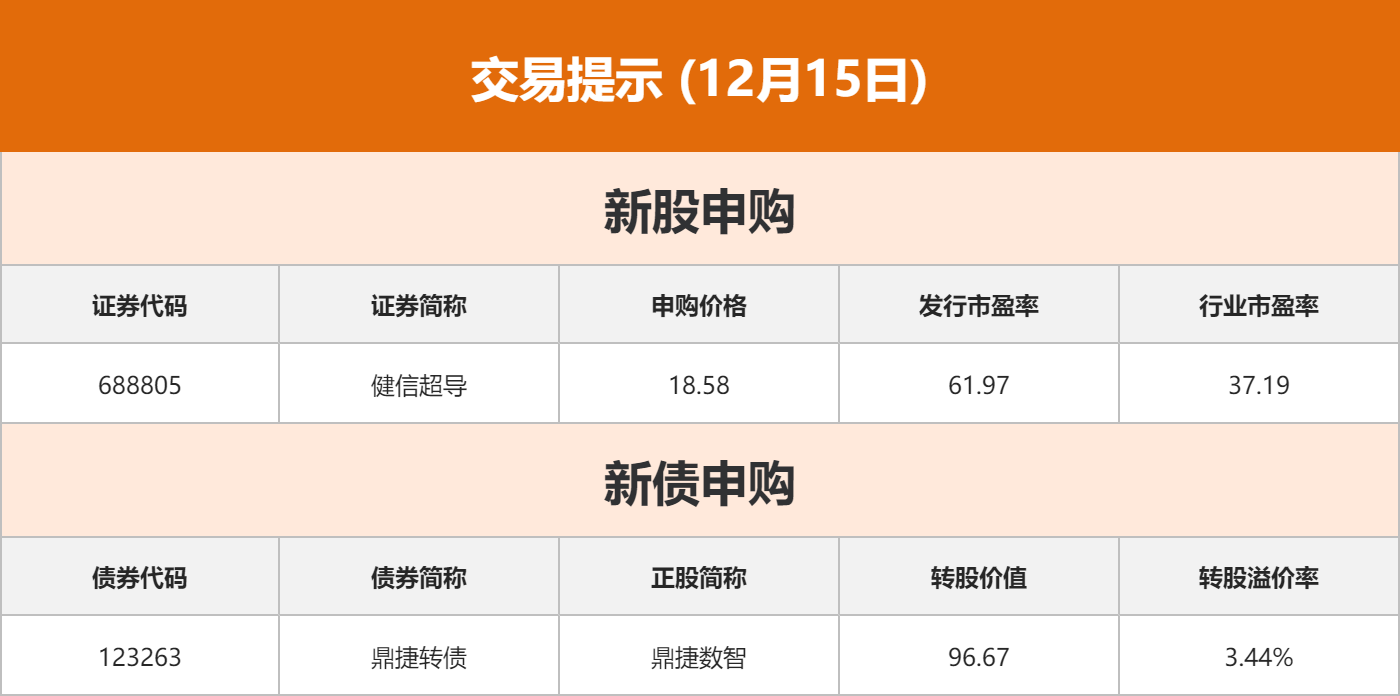 公司新闻万科:公告显示,万科“22万科MTN004”持有人会议三项展期议案均未获有效通过,核心展期规则均为展期一年且期间不付本息,差异在增信安排。议案一未设增信,无人同意;议案二增信加调整本息兑付,获83.40%同意;议案三仅一票同意。万科还有5个工作日宽限期谈判。 顺灏股份:轨道辰光的“天数天算”业务可能在未来5年内才有明确的商业价值,太空数据中心的“地数天算”业务可能在未来5-10年才逐步具备与地面数据中心进行竞争的优势。太空数据中心面临强烈辐射、轨道维护困难、碎片危害以及与数据治理和太空交通相关的监管问题等障碍,包括但不限于上述各类因素均可能导致项目商业化进度和效益晚于和低于预期。 人福医药:公司于2025年12月12日收到中国证券监督管理委员会湖北监管局下发的《行政处罚事先告知书》。根据中国证监会行政处罚事先告知书载明的事实,公司披露的年度报告财务指标存在虚假记载,公司股票将被实施其他风险警示。实施后A股简称为ST人福,股票12月15日起停牌一天。 永鼎股份:公司下属控股子公司东部超导主营产品是第二代高温超导带材及超导应用产品,公司不直接生产制造可控核聚变装置,仅为绕制装置的磁体提供材料。2025年1-9月营业收入占公司整体收入比重不足1%,且亏损,不会对公司业绩产生重大影响。 芯原股份:近日,公司近日收到芯来智融管理层及交易对方关于终止发行股份及支付现金购买芯来智融97.0070%股权并募集配套资金的通知,为切实维护公司及全体股东利益,经充分审慎研究,公司同意终止本次重大资产重组交易。 恩捷股份:公司拟通过发行股份方式向郅立鹏、青岛众智达投资有限公司、陈继朝、杨波、袁军等交易对方购买其所持有的青岛中科华联新材料股份有限公司(简称“中科华联”)100%的股份,并拟向不超过35名符合条件的特定对象发行股份募集配套资金。股票将于12月15日起复牌。 科华数据:公司已与沐曦、壁仞、燧原等国产GPU芯片厂商开展业务合作,全力支持自主可控的算力生态体系建设。例如,公司已与沐曦股份联合推出高密度液冷算力POD,以超节点作为核心技术切入点来探索相关解决方案,为高性能算力需求提供稳定、高效、灵活扩展的实时保障。 隆盛科技:公司与无锡市滨湖区人民政府签署《新型工业用地投资发展监管协议》,控股子公司隆盛唯睿与无锡市滨湖区蠡湖街道办事处签署《江苏隆盛唯睿具身智能机器人创新中心培育项目落地合作协议》。计划在无锡滨湖区投资建设江苏隆盛唯睿具身智能机器人创新中心项目。项目总投资额约3.5亿元。 雷赛智能:公司拟向特定对象发行股票募集资金总额不超过11.44亿元,将用于智能装备运动控制核心零部件研发及产业化项目、信息化建设及智能仓储项目及补充流动资金。 >">>">点击查看更多上市公司重大公告>> 环球市场 交易提示![]() 点击立即参与申购>> 债市纵览Shibor:12月12日,隔夜shibor报1.2790%,下跌0.40个基点;7天shibor报1.4510%,上涨1.90个基点;14天shibor报1.5090%,上涨0.90个基点;1月shibor报1.5250%,上涨0.10个基点;3月shibor报1.5850%,上涨0.10个基点。 欧债:欧市尾盘,德国10年期国债收益率涨1.4个基点,报2.857%,本周累计上涨5.9个基点。两年期德债收益率跌0.6个基点,报2.154%,本周累涨5.9个基点;30年期德债收益率涨2.9个基点,报3.481%,本周累涨5.1个基点。2/10年期德债收益率利差涨2.153个基点,报+70.142个基点,本周大致持平。本周,法国10年期国债收益率累计上涨5.4个基点,周五欧市尾盘报3.577%,2年期法债收益率累涨5.6个基点,报2.370%;30年期法债收益率累涨4.1个基点。意大利10年期国债收益率累涨6.3个基点,报3.548%。西班牙10年期国债收益率累涨4.5个基点,报3.306%。希腊10年期国债收益率累涨6.6个基点,报3.461%。英国10年期国债收益率涨3.3个基点,报4.517%,本周累计上涨4.0个基点。两年期英债收益率跌2.4个基点,报3.747%,本周累跌3.4个基点,美联储宣布降息与国库券购买计划之后,持续走低。30年期英债收益率涨6.1个基点,报5.268%,本周累涨7.4个基点;50年期英债收益率涨5.9个基点,报4.737%,本周累涨6.1个基点。2/10年期英债收益率利差涨5.535个基点,报+76.685个基点,本周累涨7.264个基点。 美债:纽约尾盘,美国10年期基准国债收益率涨2.75个基点,报4.1841%,本周累计上涨4.90个基点。两年期美债收益率跌1.82个基点,报3.5222%,本周累跌3.81个基点。20年期美债收益率累涨5.71个基点,报4.8089%;30年期美债收益率累涨5.27个基点,报4.8445%。三年期美债收益率累跌0.66个基点,报3.5775%;五年期美债收益率累涨3.04个基点,报3.7417%;七年期美债收益率累涨4.19个基点,报3.9440%。三个月期国库券/10年期美债收益率利差累涨13.410个基点,报+56.134个基点。 商品期货国内期货:12月12日,国内商品期货收盘,互有涨跌。沪锡涨超4%,沪银涨超3%,续创新高,国际铜、沪锌等涨超2%,沪金、工业硅涨超1%,生猪、NR等小幅上涨;焦煤、液化气跌逾4%,焦炭、红枣跌超3%,鸡蛋、PVC等跌超2%,棕榈油、PP等跌逾1%,PX、SS等小幅下跌。 国际金银:COMEX黄金期货当月连续合约上涨16.80美元,涨幅0.39%,报4329.8美元/盎司。COMEX白银期货收跌3.88%,报62.085美元/盎司。 国际原油:国际油价12月12日下跌。截至当天收盘,纽约商品交易所WTI原油期货当月连续合约下跌0.07美元,收于每桶57.53美元,跌幅为0.12%。 国际金属:LME期铜收跌357美元,报11515美元/吨