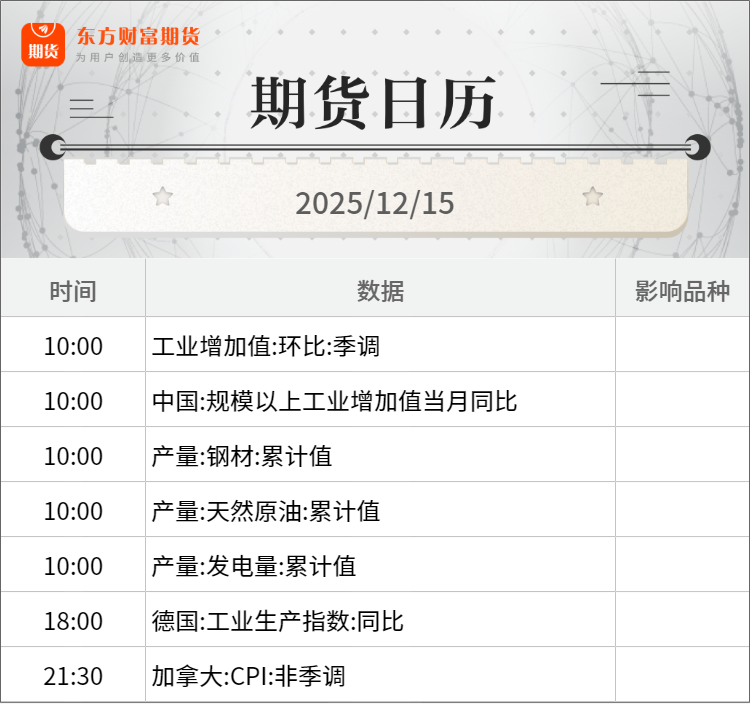 隔夜行情![]() ![]() 每日精选时隔16年 我国再对钢铁实施出口许可证管理 黄金上涨逼近前高 白银突发剧烈调整!机构怎么看? 锚定产业需求 碳酸锂期货基准交割品指标升级 服务实体效能再提升 宏观产经中国证券报:12月13日,中央财办分管日常工作的副主任、中央农办主任韩文秀在2025-2026中国经济年会上表示,做好明年经济工作,要坚持稳中求进,提质增效,加大逆周期和跨周期调节,切实提升宏观经济治理效能。去年9月26日中央政治局会议以来,先后出台实施了一系列政策措施,明年还将根据形势变化出台实施增量政策。 央行网站:初步统计,2025年11月末社会融资规模存量为440.07万亿元,同比增长8.5%。2025年前十一个月社会融资规模增量累计为33.39万亿元,比上年同期多3.99万亿元。11月末,广义货币(M2)余额336.99万亿元,同比增长8%。前十一个月人民币贷款增加15.36万亿元。 新华社:全国金融系统工作会议12月12日在京召开。中共中央政治局委员、中央金融委员会办公室主任何立峰出席会议并讲话。他强调,金融系统要深入学习贯彻中央经济工作会议精神,准确把握经济工作面临的形势和主要目标任务,坚定做好金融工作的信心和决心,坚持防风险、强监管、促高质量发展工作主线,有力有序有效做好2026年金融重点工作。 品种资讯黑色系期货 焦炭:12日山东市场主流钢厂对焦炭采购价湿熄下调50元/吨,干熄下调55元/吨,调整后具体情况如下: 1、准一级(湿熄)冶金焦:A≤13,S≤0.75,CSR≥60,CRI≤30,MT≤7,调整后执行1495元/吨,不分省内外; 2、准一级(干熄)冶金焦:A≤13,S≤0.75,CSR≥60,CRI≤30,MT0,调整后执行1750元/吨,不分省内外; 3、二级冶金焦:A≤13.5,S≤0.8,CSR≥58,MT≤7,调整后执行1435元/吨; 以上均为基价,到厂承兑含税价,2025年12月12日0时起执行。 12月12日河北市场钢厂对焦炭采购价下调50/55元/吨,调整后:一级湿熄焦(A≤12.5,S≤0.7,CSR≥65,MT≤7),报1660元/吨;一级干熄焦(A≤12.5,S≤0.7,CSR≥65,MT≤0),报2030元/吨(顶装焦);以上均为到厂承兑含税价,12日0时起执行。(Mysteel) 钢材:12月12日,首钢长钢对建筑钢材价格调整如下:1、HRB400E材质螺纹钢价格下调20元,Φ20mm螺纹钢3050元;2、HPB300线材价格下调30元,Φ8-12mm高线3190元;3、HRB400E盘螺价格下调30元,Φ8-10mm盘螺3190元;以上价格均为现款含税。(西本新干线) 铁矿石:全国47个港口进口铁矿库存总量16111.47万吨,环比增加120.36万吨;日均疏港量334.17万吨,降0.06万吨。全国45个港口进口铁矿库存总量15431.42万吨,环比增加130.61万吨;日均疏港量319.19万吨,增0.74万吨;在港船舶数量107条,降2条。 全国钢厂进口铁矿石库存总量为8834.2万吨,环比减150.53万吨;当前样本钢厂的进口矿日耗为283.27万吨,环比减1.80万吨;库存消费比31.19天,环比减0.33天。(Mysteel) 农产品期货 豆粕:2025年第50周(12月6日至12月12日)国内油厂大豆实际压榨量203.75万吨,较上一周实际压榨量减1.83万吨,较预估压榨量低17.41万吨;实际开机率为56.05%。(Mysteel) 生猪:截至12月12日14:00时,全国农产品批发市场猪肉平均价格为17.50元/公斤,比昨天下降0.7%。(农业农村部) 棕榈油:12月12日马来西亚棕榈油离岸价为1025美元,较上日跌17.5美元,进口到岸价为1055美元,较上日跌17.5美元,进口成本价为8927.25元,较上日跌154.52元。进口利润为负377.25元/吨,较上日上涨34.52元/吨。(中国粮油商务网) 棉花:据Mysteel调研显示,截止至12月11日,进口棉主要港口库存39.03万吨,连续第10周增加,续刷5个月高点。其中,山东地区青岛、济南港口及周边仓32.7万吨,同比减少21.40%,江苏地区张家港港口及周边仓库进口棉库存约3.41万吨,其他港口库存约2.92万吨。(Mysteel) 有色/贵金属期货 碳酸锂:行业咨询机构Adamas Intelligence指出,随着电动汽车普及进入相对成熟阶段,储能需求的增长将成为2026年电池生产进而影响锂需求的“最大波动因素”。花旗集团、瑞银集团和伯恩斯坦预测,这种扩张将推动全球锂市在明年出现供不应求的局面。储能领域对锂的需求明年可能增长55%,远超电动汽车领域19%的增幅。(财联社) 多晶硅:截至12月12日,本周多晶硅(N型致密料)市场均价50元/千克,生产成本约41.58元/千克,净利为8.42元/千克。价格方面,本周多晶硅N型致密料均价环比持平。成本方面,硅粉价格上涨,成本环比上涨0.21元/千克。本周多晶硅环节净利润环比下降0.21元/千克。(Mysteel) 广州期货交易所公告,近期,2组7名客户在多晶硅期货相关合约持仓数量超过交易所规定的持仓限额。根据《广州期货交易所风险管理办法》第二十二条、第二十八条等有关规定,交易所决定对上述客户采取限制开仓6个月的监管措施。(财联社) 近日,由多家硅料龙头企业联合投资设立的北京光和谦成科技有限责任公司正式登记成立,这被视为光伏行业“反内卷”的重要一步。证券时报记者从业内知情人士处获悉,未来,相关企业规划保留的硅料产能不会超过150万吨。(证券时报) 能化期货 原木:港口现货价格方面,山东原木港口现货价格740元/方,周内下跌10元/方,江苏原木现货价格730元/方,周内下跌10元/方;下游成品价格方面,周内山东、太仓、重庆、新民洲、天津、广东多地建筑木方价格下跌。(Mysteel) PVC:截止2025年12月12日,中国PVC产能利用率在79.43%,环比下降0.46%。本周常规性检修虽然不多,但是部分企业临时降负,影响国内PVC供应量小幅下降。本期开工下降主要来自宁波镇洋、宜宾天原、河南宇航等,影