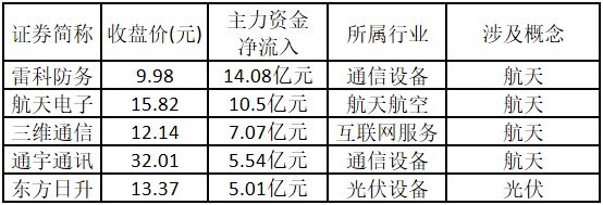 (注:创出近一年新高的涨停股,说明该股走出重要突破行情,值得重点关注。) 从主力资金来看,今日涨停板个股中,主力资金净流入金额排名前5的个股分别为雷科防务、航天电子、三维通信、通宇通讯、东方日升。