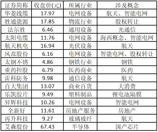 (注:创出历史新高的涨停股,说明该股人气旺盛、趋势明确,且上方无阻力,延续原上涨趋势概率较大。) 涨停板个股中,股价创出近一年新高的个股有15只(不包括创出历史新高的个股),包括华菱线缆、胜通能源、法尔胜、太阳电缆、航天机电、风范股份、太钢不锈、重药控股、雷科防务、百大集团、乐凯胶片、昇辉科技、全新好、再升科技、艾森股份,具体如下表所示。
