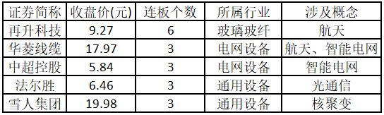(注:封板资金越多的个股,说明该股被资金追捧,其延续上涨概率较大。) 从连板情况来看,今日首板个股有46只;2连板的个股有6只;3连板及以上的个股有7只。今日连板数排名前5的个股包括再升科技、华菱线缆、中超控股、法尔胜、雪人集团,具体如下表所示。