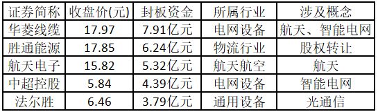 (注:主力资金净流入金额占市值比例越高的个股,说明该股被主力资金重点关注,值得重点关注。) 从封板资金来看,今日涨停板个股中,封板资金排名前5的个股包括华菱线缆、胜通能源、航天电子、中超控股、法尔胜。