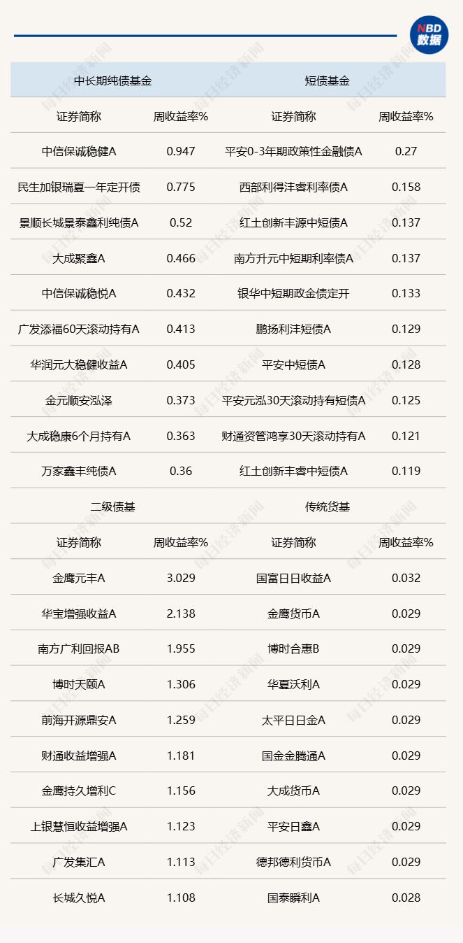 每经记者|任飞 每经编辑|赵云 上周,债市久违地出现修复,但总体呈先扬后抑的态势,震荡依然明显。 值得注意的是,纯债基金业绩均值终于回正。有分析指出,目前影响债市的因素有很多,但需要重视债券供给的压力,年内若无新增信息指引,债市或很难走出当前的困境。 纯债基金业绩回升,单周业绩告负产品数量降低上周(12月8日至14日),国债期货先扬后抑,周初,国债期货主力合约全线收涨,30年期等长期品种表现相对强势,然而,市场情绪在上周五发生显著转变,当日各期限国债期货主力合约全线收跌,其中30年期品种跌幅尤为明显。 有分析指出,前半周驱动债期反弹的动力一方面来自于超跌反弹后的技术性补缺需求,另一方面是由于资金价格不断走低,流动性较为充裕。后半周配合重磅会议落地和补缺结束,债期随即开始调整。 债券型基金的业绩相较前一周有所好转,纯债基金不再呈现业绩均值告负的情形。Wind统计显示,上周业绩最好的纯债基金是中信保诚稳健A,业绩达0.95%。中长期纯债基金当中,有28只基金周业绩告负,较此前单周业绩告负的基金数量大幅降低(统计初始基金)。 之所以看重中长期纯债基金,是因为很长一段时间以来,超长债已经陷入了“越跌越卖、越卖越跌”的尴尬局面。此外,股市跟债市之间的“跷跷板效应”也在减弱,故而在近期股市回调过程中,债市并没有对部分资金形成吸引力。 方正证券研报指出,近期超长债调整主要由交易机构行为驱动,而非基本面或宏观政策变化。年末配置盘承接能力承压,叠加公募基金费率改革引发被动赎回压力,基金、券商等交易性机构进一步减持长债,形成负循环。当前超长债性价比显著提升,建议逢低布局,控制节奏,采取哑铃型配置策略。