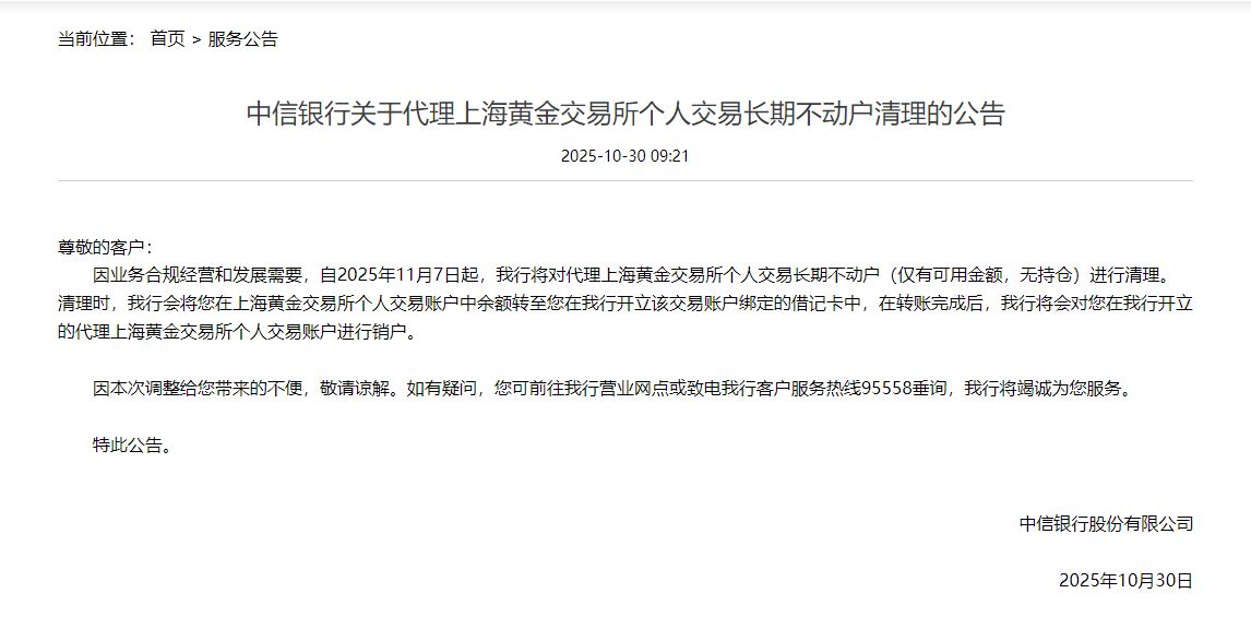 不只是国有大行,股份行亦有行动。中信银行便在10月30日称,因业务合规经营和发展需要,自11月7日起,将对代理上海黄金交易所个人交易长期不动户(仅有可用金额,无持仓)进行清理。清理时,该行会将客户在上海黄金交易所个人交易账户中余额转至客户在该行开立该交易账户绑定的借记卡中,在转账完成后,该行将会对客户在该行开立的代理上海黄金交易所个人交易账户进行销户。