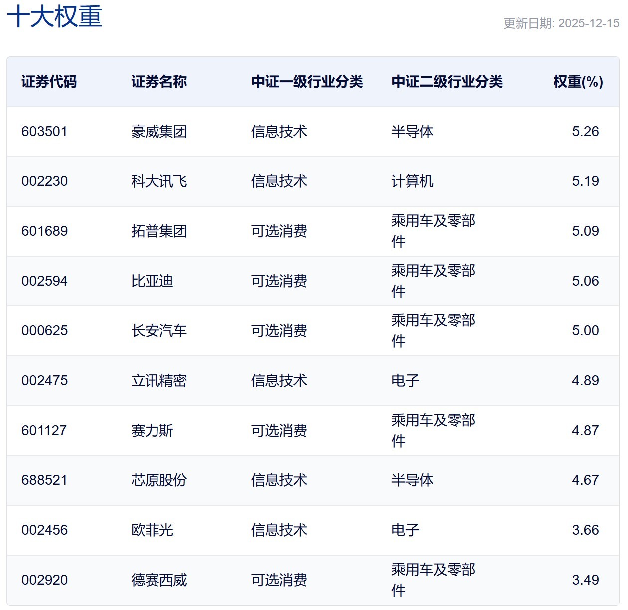 中证智能汽车主题指数前十大权重股 封面图片来源:每日经济新闻 |