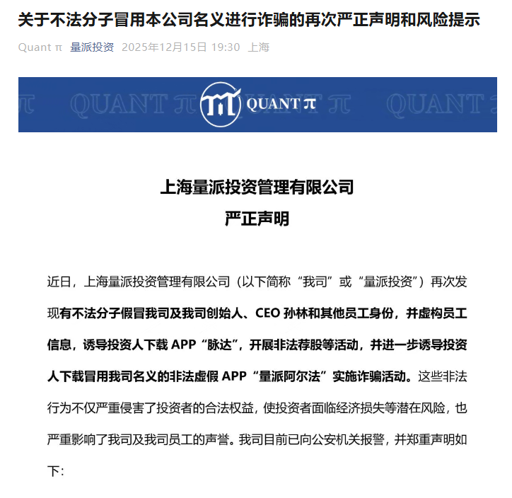 创始人再遭“李鬼”顶替 百亿量化私募严正声明:已报警 在丁冬财经看资讯行情,选丁冬财经证券一站式开户交易>> 百亿量化私募创始人又遭“李鬼”顶替。 近日,21财经《辟谣财知道》注意到,有不法分子再次假冒上海量派投资管理有限公司(以下简称“量派投资”)创始人、CEO孙林和其他员工身份,并虚构员工信息,诱导投资人下载APP“脉达”,开展非法荐股等活动,并进一步诱导投资人下载冒用我司名义的非法虚假APP“量派阿尔法”实施诈骗活动。 此前,已有不法分子假冒量派投资创始人及其员工身份,以实施电信诈骗或骗取投资者信息,涉嫌违法犯罪。 12月15日晚,量派投资严正声明,相关非法行为不仅严重侵害了投资者的合法权益,使投资者面临经济损失等潜在风险,也严重影响了公司及公司员工的声誉。目前,量派投资已向公安机关报警。 ![]() 量派投资提醒,公司为中国证券投资基金业协会登记的私募基金管理人,经营范围为私募证券投资基金管理服务,公司发行产品为私募证券投资基金,所有产品均可以在中国证券投资基金业协会官网查询相关备案信息。公司及公司员工从未组织或进行过任何培训活动、直播教学等非法活动。任何假冒量派投资及员工名义以荐股、提供内幕消息等方式向投资者邀请入会、收取费用、承诺收益、盈利分成等行为均为诈骗行为。 截至目前,量派投资从未开发或发行过任何交易软件或交易程序,全网与“上海量派投资管理有限公司”“量派阿尔法”等相关交易软件均与公司无关,系不法分子冒用公司或公司员工名义创建的诈骗工具。 量派投资建议,投资者要参与私募基金投资,应通过拥有基金销售资格的正规渠道了解和购买私募基金产品,并对销售人员的基金从业资格进行审慎识别。 公开资料显示,量派投资于2019年成立,2020年9月取得私募基金管理人牌照后全面转型资管业务。目前,量派投资拥有“指数增强策略”“中性策略”“CTA 策略”等产品线,管理规模于2024年10月突破百亿。 (声明:文章内容仅供参考,不构成投资建议。投资者据此操作,风险自担。) (文章来源:21世纪经济报道) |