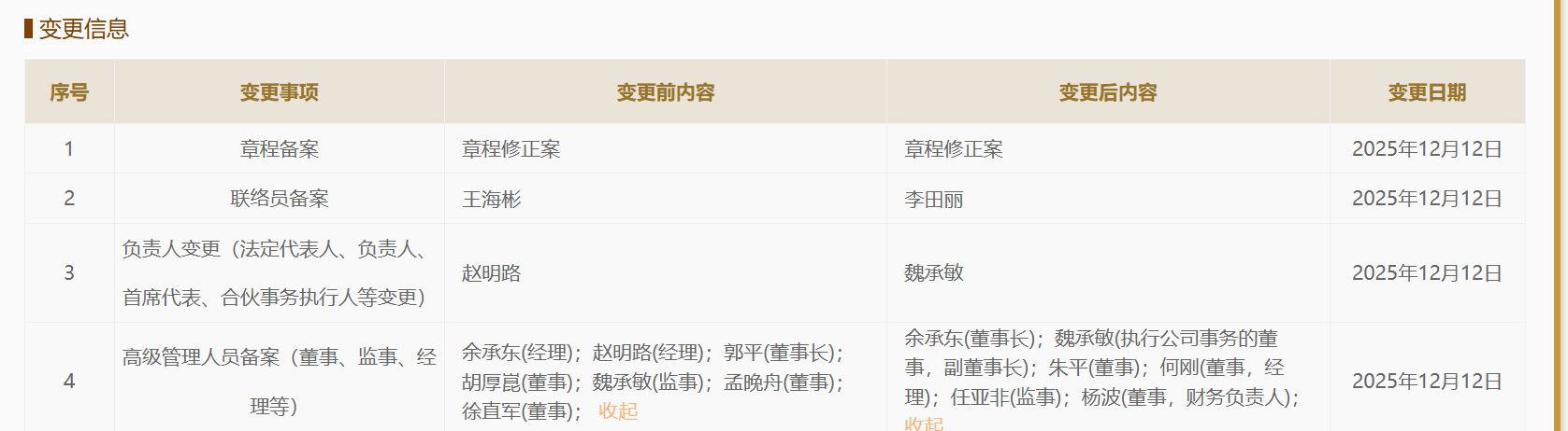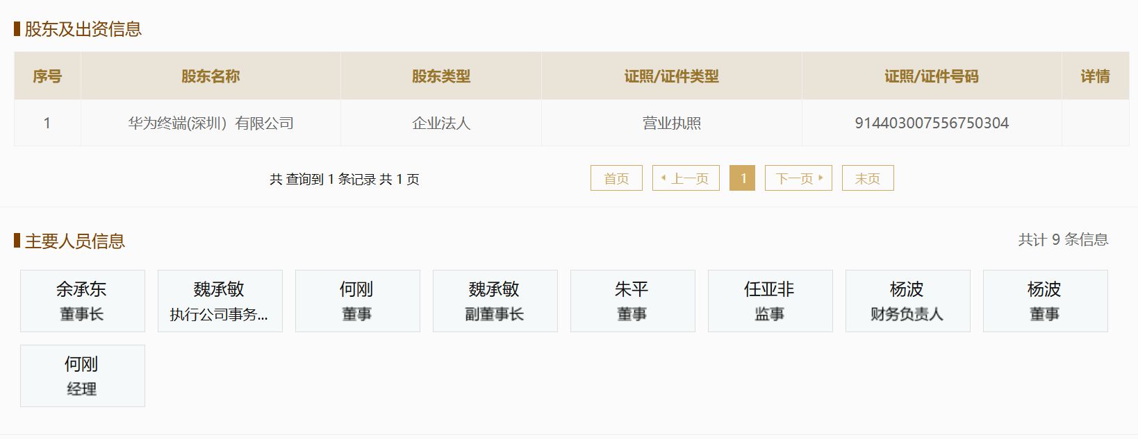 每经编辑|张锦河 国家企业信用信息公示系统及天眼查工商信息显示,近日,华为终端有限公司发生工商变更,郭平卸任董事长,由余承东接任,孟晚舟、徐直军等卸任董事,同时,多位高管发生变更。 华为终端有限公司成立于2012年11月,法定代表人为魏承敏,注册资本6.06亿人民币,经营范围含开发、生产、销售通信及电子产品、计算机、卫星电视接收天线、高频头、数字卫星电视接收机及前述产品的配套产品,并提供技术咨询和售后服务等。股东信息显示,该公司由华为终端(深圳)有限公司全资持股。
