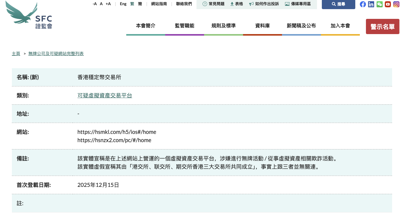 香港证监会网站显示,12月15日,香港证监会将“香港稳定币交易所”列入可疑虚拟资产交易平台警示名单。香港证监会表示,该实体宣称是在上述网站上营运的一个虚拟资产交易平台,涉嫌进行无牌活动/从事虚拟资产相关欺诈活动。该实体虚假宣称其由“港交所、联交所、期交所香港三大交易所共同成立”,事实上跟三者并无关连。