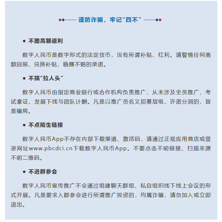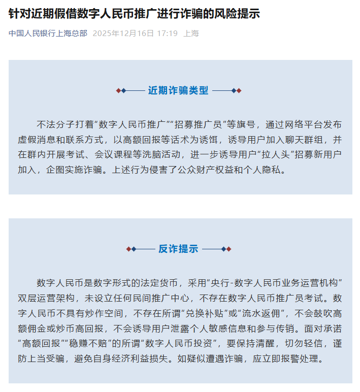 央行上海总部:数字人民币不具有炒作空间 谨防上当受骗 炒股第一步,先开个股票账户 中国人民银行上海总部发布针对近期假借数字人民币推广进行诈骗的风险提示称,数字人民币是数字形式的法定货币,采用“央行-数字人民币业务运营机构”双层运营架构,未设立任何民间推广中心,不存在数字人民币推广员考试。数字人民币不具有炒作空间,不存在所谓“兑换补贴”或“流水返佣”,不会鼓吹高额佣金或炒币高回报,不会诱导用户泄露个人敏感信息和参与传销。面对承诺“高额回报”“稳赚不赔”的所谓“数字人民币投资”,要保持清醒,切勿轻信,谨防上当受骗,避免自身经济利益损失。如疑似遭遇诈骗,应立即报警处理。 ![]() ![]() (文章来源:第一财经) |