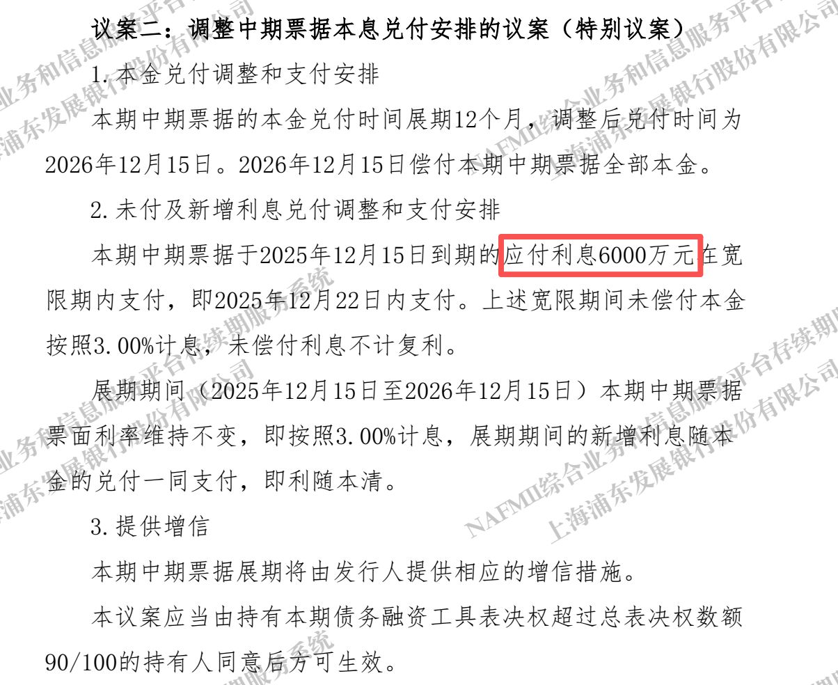 每经记者|黄婉银 每经编辑|陈梦妤 万科首个展期方案又迎来变化。 12月16日晚,浦发银行公布了“22万科MTN004”第二次持有人会议议案。与第一次相比,本次虽也有三个议案,但仅有议案二与本息兑付有关。 一是关于豁免本次持有人会议召集、召开程序的相关时限要求的议案,持有人会议的全部议案应当在会议召开首日后的3个工作日的10点前完成表决(即2025年12月22日10点前)。 同样,该议案也需要获得超过90%的有效表决同意,该议案通过后才能正式进行展期议案的投票表决。