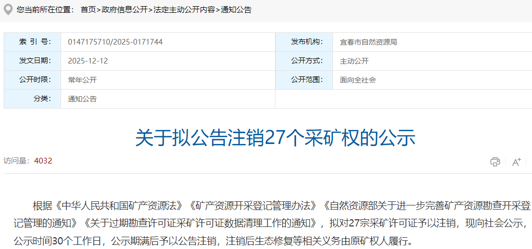 炒股第一步,先开个股票账户 12月17日,A股上市公司江特电机公告称,宜春市自然资源局网站于近日发布了《关于拟公告注销27个采矿权的公示》(下称《公示》),公司的江西省宜丰县狮子岭矿区含锂瓷石矿是本次公示拟注销的27个采矿权之一。公司已向宜春市自然资源局提交了《关于宜丰县狮子岭矿区含锂瓷石矿拟注销公示的异议申请》,提出相关解决方案,尽最大努力争取延续狮子岭矿区采矿证。同时,公司正在全力办理茜坑锂矿投产前的各项准备工作,力争早日投产。 据了解,此次狮子岭矿区采矿权拟注销,是当地自然资源部门依据矿产资源相关法规开展的集中清理工作,27个采矿权一同被列入拟注销名单。期货日报记者查询宜春市自然资源局发布的《公示》获悉,根据《中华人民共和国矿产资源法》《矿产资源开采登记管理办法》和《自然资源部关于进一步完善矿产资源勘查开采登记管理的通知》等相关要求,拟对高安市伍桥瓷石矿等27宗采矿许可证予以注销。目前,宜春市自然资源局已对拟注销的27宗采矿许可证进行公示,公示期(30个工作日)满后予以公告注销。注销后,生态修复等相关义务由原矿权人履行。 ![]() 从上述27宗采矿许可证的矿种来看,17宗矿种为陶瓷土矿,7宗为石灰岩,其他矿种包括高岭土、石英岩。 值得注意的是,此次拟注销的27宗采矿许可证的有效期均已过期。其中,18宗采矿权许可证有效期在2010—2019年已经到期,1宗采矿权有效期为2023年到期,5宗采矿权许可证有效期在2024年已到期。 从供需关系来看,中信期货分析师王美丹认为,此次拟公告注销的27个采矿权许可证均已过期,对碳酸锂的实际供应影响或较为有限。 “虽然本次拟注销27个采矿权对碳酸锂供应量实质影响较小,但此次注销名单中,17宗矿种登记为陶瓷土,其核心深意在于厘清长期存在的陶瓷土与锂矿的权证边界。”王美丹认为,此举是宜春市整顿矿产资源管理秩序的重要一环,表明“亚洲锂都”正在迈向以战略性矿产资源安全保障和绿色可持续发展为核心的新阶段。 期货日报记者查询宜春市自然资源局官网发现,此次拟公告注销相关采矿权的工作或为常规公示。今年7月1日,新矿产资源法实施,将锂列为独立矿种。今年10月28日和11月27日,宜春市自然资源局先后发布《关于公告注销2宗采矿许可证的公示》《关于公告注销6个采矿许可证的公示》的同类公告。 (文章来源:期货日报) |