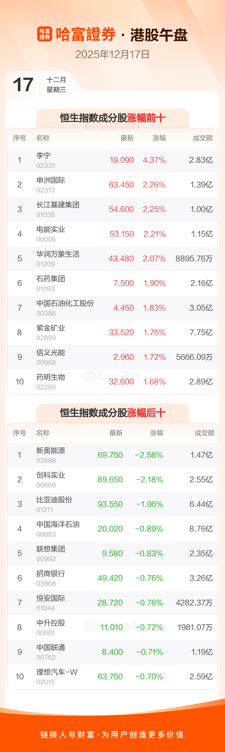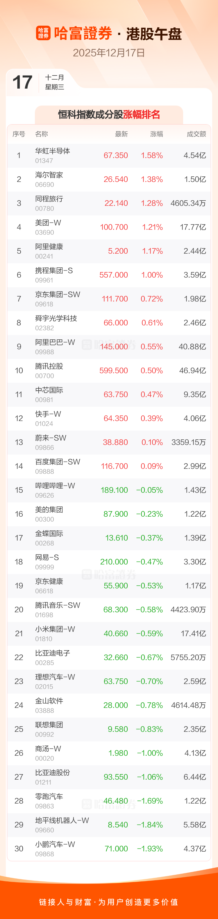全新妙想投研助理,立即体验 港股12月17日午盘走高,恒生指数收报25291.44点,涨56.03点,涨幅0.22%;恒生科技指数收报5403.74点,涨1.23点,涨幅0.02%。恒生指数成分股中李宁、申洲国际、长江基建集团涨幅居前,新奥能源、创科实业、比亚迪股份跌幅靠前。恒生科技指数成分股中华虹半导体、海尔智家、同程旅行涨幅居前,小鹏汽车-W、地平线机器人-W、零跑汽车跌幅靠前。