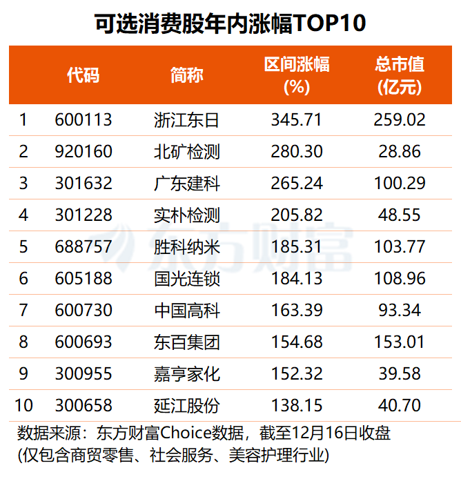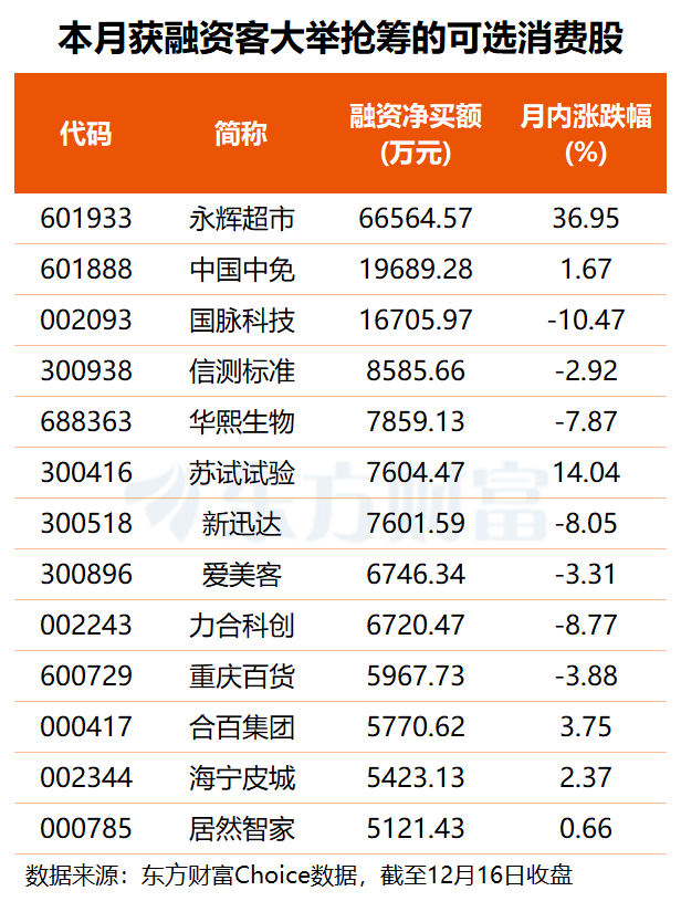 永辉超市等3股获融资客大幅加仓 东方财富Choice数据显示,按申万一级行业分类,目前A股市场上属于商贸零售、社会服务、美容护理行业的可选消费股共211只(不含汽车、家电等,下同),合计总市值约1.97万亿元。 市场表现方面,共140只可选消费股年内股价实现上涨,占比约66%,其中,浙江东日、国光连锁、东百集团、若羽臣等11股年内股价翻倍,依依股份、全新好、凯撒旅业等19股年内涨幅在50%至100%之间。 ![]() 业绩层面,今年前三季度净利同比增长的可选消费股仅103只,占比不足五成。其中,净利实现翻倍式增长的有15股,宁波中百、*ST沪科、桂林旅游、中顺洁柔前三季度的净利增幅均在3倍以上。 资金方面,东方财富Choice数据显示,12月以来,共有57只可选消费股获得融资客青睐。其中,永辉超市月内获融资客大举抢筹约6.66亿元,中国中免、国脉科技融资净买额分别达1.97亿和1.67亿元,爱美客、重庆百货、居然智家等10股均获超5000万元融资净买入。 永辉超市前三季度业绩有所下滑,开源证券研报指出,公司向品质零售转型进展顺利,目前处于供应链改革和门店优化转型期,短期业绩有所承压,但长期经营拐点可期。 作为免税概念龙头,中国中免今年前三季度实现营收398.62亿元,归母净利润为30.52亿元。中航证券表示,公司Q3业绩拐点明确,核心海南业务企稳回升,市内免税政策落地为第二成长曲线打开新空间。随着离岛政策优化、口岸渠道复苏及数字化运营深化,公司有望重回业绩增长轨道。 ![]() (文章来源:东方财富研究中心) |