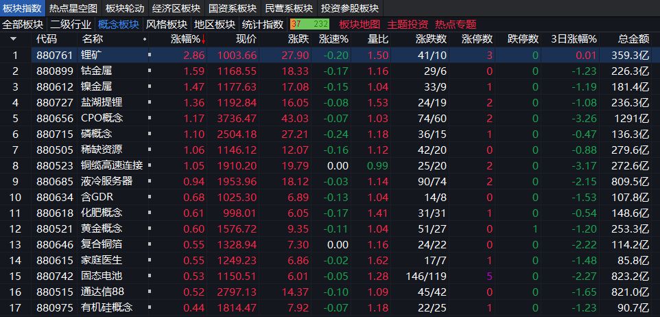 每经记者|杨建 每经编辑|彭水萍 A股三大指数集体上涨,创业板指上涨逾1%。盘面上,能源金属、锂矿概念、CPO概念、化肥行业、旅游酒店、航空机场、氟化工、医药商业位于涨幅榜前列;海南板块、时空大数据、电子化学品、电子后视镜、船舶制造表现不佳,领跌市场。其中,商业航天早盘调整后逐渐企稳回升。