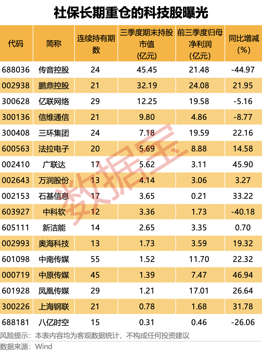 社保基金持仓科技股市值创历史同期新高。 社保基金会12月16日消息,社保基金会党组书记、理事长刘昆12月15日主持召开党组会议,传达学习中央经济工作会议精神,研究贯彻落实工作。会议提出,充分发挥长期资金、耐心资本作用,积极服务国家发展需要,更好支持科技创新和产业创新深度融合。 从资产配置来看,截至今年三季度末,社保基金重仓科技股(TMT四大板块:申万电子、通信、计算机和传媒)期末市值超过469亿元,创出历史同期新高,彰显出社保基金对科技股的日益青睐。 社保基金重仓 科技股市值创新高 从行业分布来看,社保基金持有电子行业期末市值接近274亿元,在科技板块中持股市值最高。其次是计算机板块,社保基金期末持股市值超过77亿元。另外,社保持有传媒、通信行业期末市值分别为73.22亿元和44.33亿元。 往前看,社保基金持有科技股市值已经创出历史同期新高,同比去年三季度末大幅增长近61%,相比2011年同期大幅增长18倍多。 从个股来看,传音控股有3只社保基金持仓,期末持股市值超过45亿元居首。 开源证券认为,公司手机产品持续向中高端转型并拓展更多市场,非洲地区智能机渗透率提升也有望带来长期增量,公司有望凭产品多元化、业务全球化、品类高端化保持快速增长。 此外,鹏鼎控股、分众传媒、紫光国微、深南电路等多只个股社保持仓市值均超过10亿元。 新进这些股 从持仓动向来看,全国社保基金一一三组合和基本养老保险基金八零二组合三季度新进持仓紫光国微2092.54万股,期末持股市值近19亿元居首。 民生证券表示,紫光国微作为特种芯片龙头,将持续受益于特种IC行业成长和国产替代需求增长。 全国社保基金一一一组合和社保基金四二零组合三季度新进建仓巨人网络2784.82万股,期末持股市值超12.58亿元位居次席。 太平洋证券表示,公司征途IP系列游戏稳健运营,《超自然行动组》贡献增量。未来随着《超自然行动组》《原始征途》等递延收入的陆续确认,有望推动公司业绩逐步释放。 此外,社保基金三季度还新进成为亨通光电、乐鑫科技、生益科技等个股的前十大流通股东,期末持仓市值均超5亿元。 长期持仓股曝光 值得注意的是,社保基金还长期重仓了一些科技股。数据显示,社保基金连续重仓中南传媒、中原传媒、凤凰传媒、亿联网络、三环集团、传音控股6股24个季度及以上。其中传音控股、亿联网络等个股期末持仓市值均超10亿元。 银河证券表示,亿联网络是全球视频会议市场龙头,看好公司AI会议产品及云办公终端方面需求,产品竞争力增加带来的市场份额提升和业绩增长,公司基本盘经营稳健推进高质量发展。 除了上述个股外,还有11只科技股获社保基金重仓3年以上。其中,鹏鼎控股期末持股市值超32亿元。 整体来看,社保长期重仓的科技股主要分为两个类型,一是行业龙头标的,且分红较为大方;另外就是股息率较高的传媒股。 ![]() (文章来源:数据宝) |
