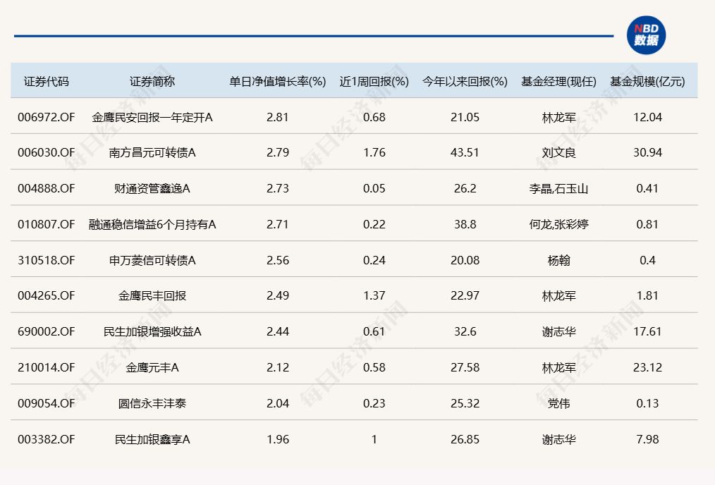 每经记者|肖芮冬 每经编辑|赵云 12月17日,市场集体反弹,沪指涨超1%,创业板指涨超3%。板块方面,能源金属、算力硬件、电池、保险等板块涨幅居前,海南、军工等板块跌幅居前。全市场超3600只个股上涨。沪深两市成交额1.81万亿元,较上一个交易日放量870亿。 下面一起来看今天公募基金的表现。 (注:榜单1、榜单2仅选取灵活配置型、偏股混合型和普通股票型三类产品作为主动基金的代表,纳入统计;债基相关榜单包括各类主、被动债券型基金) 1.单日涨幅榜