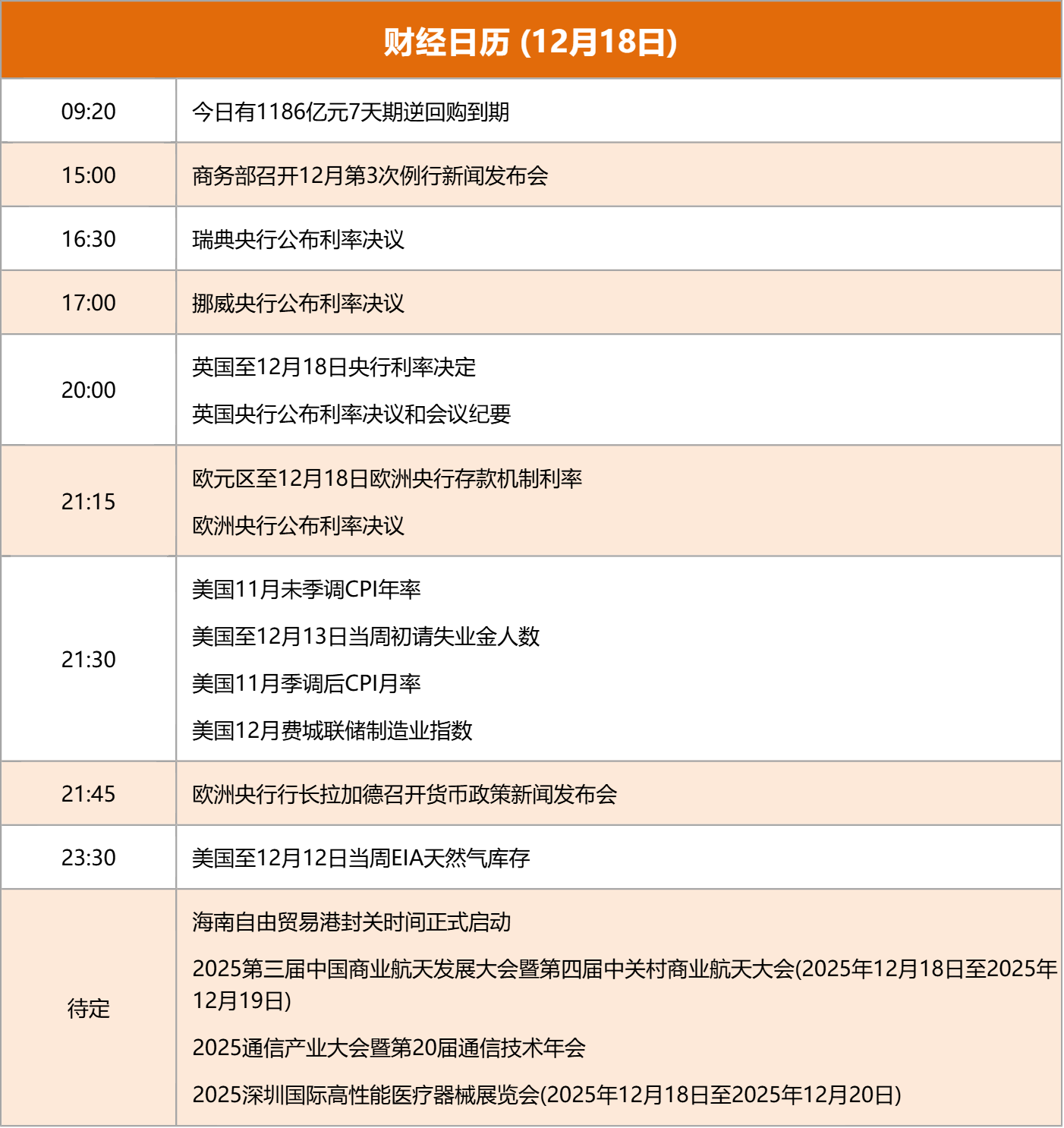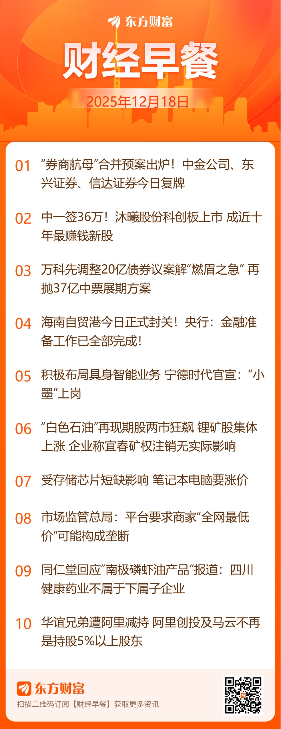 ![]() 每日精选中金公司复牌: 12月17日晚间,中金公司与东兴证券、信达证券同步披露重大资产重组预案,并拟于18日复牌。根据重组预案,本次交易定价以各方董事会决议公告日前20个交易日均价作为基准价格,吸收合并方中金公司作为存续主体,换股价格为36.91元/股,被吸收合并方东兴证券换股价格为16.14元/股,较基准价格溢价26%,信达证券换股价格为19.15元/股。根据上述价格,东兴证券、信达证券与中金公司A股的换股比例分别为1:0.4373、1:0.5188。 A股打新收益创纪录: 17日,沐曦股份正式登陆科创板,成为继摩尔线程后又一家上市的国产GPU龙头。首日上市,公司股价一路狂奔,收盘时涨幅高达692.95%,按单签500股计算,打新投资者首日盈利规模近36.26万元。若以盘中755.15%的最大涨幅测算,沐曦股份单签最大盈利达39.52万元。这两项数据不仅双双超越近期“大肉签”摩尔线程,同时也助力沐曦股份登顶A股史上“最赚钱新股”,成为首日单签盈利、单签最大盈利双纪录创造者。 煤炭清洁高效利用: 国家发展改革委等部门发布《煤炭清洁高效利用重点领域标杆水平和基准水平(2025年版)》。其中提到,鼓励和引导行业企业结合实际和长远发展,对项目实施改造升级。对新建煤炭开发利用项目和有条件的存量项目,推动清洁高效利用水平应提尽提,力争达到标杆水平。对清洁高效利用水平低于现有基准水平的存量项目,引导企业有序开展煤炭清洁高效利用改造,加快推动企业减污降碳,坚决依法依规淘汰落后产能、落后工艺。 民生领域反垄断: 17日,市场监管总局举行新闻发布会,介绍民生领域反垄断执法相关情况。市场监管总局反垄断执法一司副司长刘健介绍,近期发布的《互联网平台反垄断合规指引(征求意见稿)》提出了8个新型垄断风险,为平台企业提供务实管用的合规指导。其中提到,有的平台企业要求平台内商家销售商品价格不得高于其他竞争性平台。指引提示,平台要求商家“全网最低价”,可能构成滥用市场支配地位或者垄断协议行为。 证券印花税: 财政部发布2025年1—11月财政收支情况,1—11月,印花税4044亿元,同比增长27%。其中,证券交易印花税1855亿元,同比增长70.7%。据财政部此前发布的数据,2025年1—10月证券交易印花税收入为1629亿元,这意味着今年11月证券交易印花税为226亿元,相较于10月的181亿元环比增长24.86%。此外,2024年11月证券交易印花税为221亿元,经计算,今年11月证券交易印花税同比微增2.26%。 李乐成会见AMD CEO: 工业和信息化部部长李乐成12月17日在北京会见美国超威半导体公司(AMD)董事会主席兼首席执行官苏姿丰,双方就加强数字经济、人工智能领域合作等议题进行交流。李乐成表示,中国将坚定不移推进新型工业化,不断扩大高水平对外开放,为包括AMD在内的外资企业提供更多合作机遇。希望AMD继续深耕中国市场,与中国产业链上下游企业一道创新成长,实现互利共赢发展。 电脑涨价: 近日,有市场消息称,受存储芯片产品涨价影响,戴尔、联想等几大PC(个人计算机)厂商将上调产品价格。中国证券报记者实地探访王府井百货,商场笔记本电脑销售区的销售人员表示,确已收到涨价消息。此外,戴尔中国官方销售人员对记者表示,由于内存涨价,部分产品即将涨价,具体涨价幅度尚不清楚。 海南自贸港启动全岛封关: 海南自贸港12月18日全岛封关运作,简单来说,封关就是让海南岛成为一个海关监管特殊区域,敞开大门对接全球。这一宏大蓝图,正落地为普通人可感可知的新机遇。对企业,是“零关税”的原材料,更低的税率,更宽松准入。封关后,零关税商品从1900多种增至6600多种,覆盖74%的商品税目,企业自用的生产设备、交通运输工具,小到机械设备,大到游艇、飞机,都能免关税进口,运营成本大幅降低。 热点题材CPO: 综合机构观点看,全球光模块市场正经历从铜缆向光纤的加速替代,速率升级进入爆发期。800G已成为大厂标配,1.6T产品2026年将迎来起量元年,3.2T预计2027年投入使用。国盛证券研报数据显示,1.6T光模块零售价格已从1200美元飙升至2000美元以上,涨幅超70%。 锂矿: 宜春市自然资源局近日发布公示,根据《矿产资源法》等相关要求,其拟对27宗采矿许可证予以注销,其中就涉及江特电机旗下江西省宜丰县狮子岭矿区含锂瓷石矿,该矿年产能达120万吨。 旅游: 12月17日,元旦假期前夜火车票开抢。同程旅行《2026元旦假期旅行趋势报告》显示,进入今年12月份,元旦假期的机票、酒店民宿等主要产品预订逐步起量,整体预订热度较去年同期提升近30%。 脑机接口: 近日,中国科学院脑科学与智能技术卓越创新中心等,成功完成第二例侵入式脑机接口临床试验。研究团队采用高通量无线侵入式脑机接口系统(WRS01),让一位高位截瘫患者能够通过脑电信号稳定地操控智能轮椅与机器狗,在真实生活场景中实现自主移动与物品取用。 AI应用: 开源证券发布研报指出,火山引擎即将于12月18日至19日举办冬季FORCE大会,届时将推出豆包大模型全新成员,预计将实现性能提升和成本降低,尤其是视频生成模型有望进一步升级。此次大会将着重介绍Agent开发工具的升级以及Agent生态的扩展,推动AI技术在企业生产中的应用。 液冷: 第五届国际AIDC液冷供应链千人峰会暨·国际数据中心液冷市场趋势分析会将于12月18日至19日举办。东吴证券发表研报表示,液冷技术是解决数据中心散热压力的