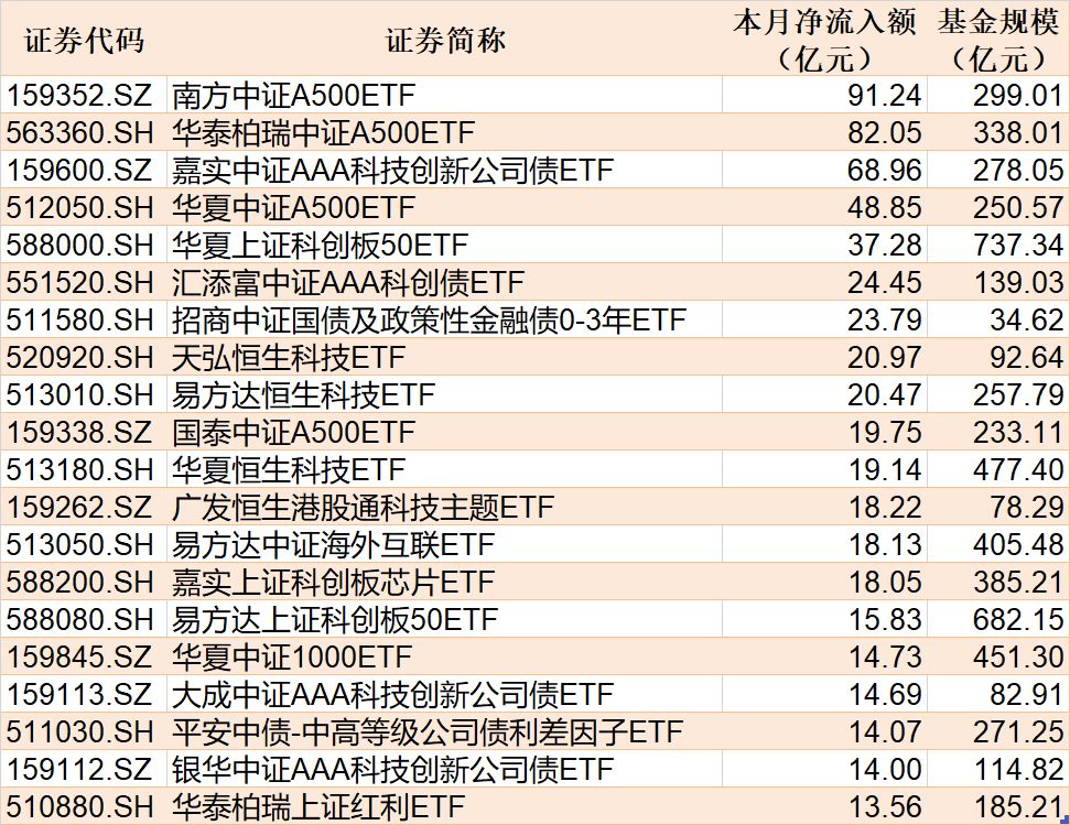 与此同时,海富通中证短融ETF基金份额减少0.11亿份,净流出额为12.07亿元;华夏上证50ETF份额减少3.35亿份,净流出额为10.38亿元;汇添富中证800ETF份额减少3.66亿份,净流出额为4.41亿元。 截至12月16日,本月资金净流入额居前20的ETF名单如下: