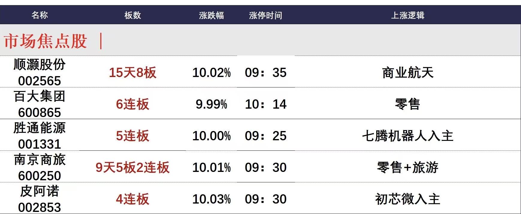 今日午盘全市场共53股涨停,连板股总数15只,12股封板未遂,封板率为82%(不含ST股、退市股)。焦点股方面,零售板块百大集团6连板、南京商旅9天5板,商业航天概念股顺灏股份15天8板,实控人变更的胜通能源5连板、皮阿诺4连板。