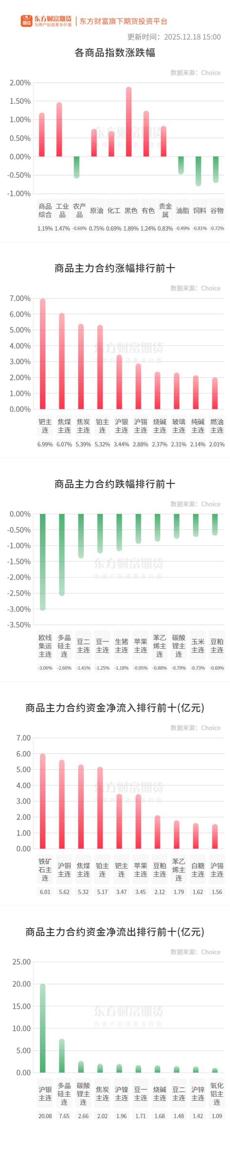 行情纵览![]() 宏观产经证券时报:证券时报推出“落实会议部署问答中国经济”系列述评,鉴于央行正逐步淡化量化目标,更加注重价格型调控工具的作用,新的一年,央行还可能进一步推动收窄利率走廊、稳定国债收益率曲线、改革贷款市场报价利率(LPR)报价等工作,加强各项利率之间的协同性和联动性,持续提升货币政策的传导效果。加强财政政策和货币政策协调配合同样有助于扩大政策效能,在贷款贴息、风险补偿、信用增进、国债发行等多个领域,财政、货币政策仍有深化合作空间。 上海证券报:今日,央行在公开市场开展883亿元7天期逆回购操作,利率维持在1.40%,并同步进行1000亿元14天期逆回购操作。东方金诚首席宏观分析师王青表示,年末临近,央行按惯例在这一时点开启14天期逆回购,主要是年末前后银行考核、财政收支、居民提现等流动性扰动因素增多,央行开展14天期逆回购,可以有效熨平资金面波动,引导市场流动性处于较为稳定的充裕状态。市场对明年初央行有可能实施新一轮降准颇有预期。综合当前经济金融运行态势及货币政策取向,预计2026年1月央行有可能宣布降准,降准幅度估计为0.5个百分点,向市场注入约1万亿元的长期流动性。这在支持明年初银行信贷大规模投放的同时,也能兼顾春节流动性安排,释放稳增长政策加力信号。 品种资讯黑色系期货 钢材:据西本新干线,12月18日,首钢长钢将HRB400E材质螺纹钢价格每吨上调30元;HPB300线材价格每吨上调30元;HRB400E盘螺价格每吨上调30元。(西本新干线) 12月17日,由中国钢铁工业协会主办、宝山钢铁股份有限公司承办的2025中国钢铁工业协会钢材市场工作委员会年会在湖北武汉召开。钢协党委常委、副会长骆铁军表示,在当前供强需弱的情况下,加强行业自律是保障行业和企业效益的关键。当前钢材出口存在的“量增价跌”问题,引发大量贸易摩擦案件。“长期大量低价出口不可持续,随着案件的逐渐生效,将影响正常的出口环境,加大国内供需压力。” 他进一步为“十五五”时期委员会开展自律工作提出3点建议:一是发挥平台作用,加强与企业沟通,加强重点共性问题的分析研究,并转化为政策建议向有关部门反映;二是加强行业自律,深入开展区域和品种自律,发挥龙头企业的引领作用,搭建上下游交流平台;三是促进有序出口,继续按照“促高端、稳周边、严监管”的出口导向,深入开展出口自律工作。(中钢协) 据Mysteel,截至12月18日当周,螺纹钢产量、表需由降转增,厂库、社库连续第十周下降:螺纹产量181.68万吨,较上周增加2.9万吨,涨幅1.62%;螺纹厂库139.54万吨,较上周减少1.26万吨,降幅0.89%;螺纹社库313万吨,较上周减少25.7万吨,降幅7.59%;螺纹表需208.64万吨,较上周增加5.55万吨,涨幅2.73%。(我的钢铁网) 焦煤:12月18日临汾安泽市场炼焦煤价格上涨100元/吨,低硫主焦精煤A9、S0.5、V20、G85出厂价现金含税1600元/吨。(我的钢铁网) 本周,Mysteel统计523家炼焦煤矿山样本核定产能利用率为86.6%,环比增1.3%。原煤日均产量192.7万吨,环比增2.9万吨,原煤库存478.9万吨,环比增6.5万吨,精煤日均产量75.8万吨,环比增0.8万吨,精煤库存272.8万吨,环比增17.5万吨。(Mysteel) 农产品期货 生猪:据农业农村部监测,截至12月18日14:00时,全国农产品批发市场猪肉平均价格为17.51元/公斤,较前一日上升0.5%;鸡蛋平均价格为7.41元/公斤,较前一日下降0.1%。(新华财经) 棕榈油:海关总署12月18日公布的数据显示,中国11月食用油进口量为103万吨,同比增加42.9%。1—11月累计进口量为903万吨,同比增加5.9%。中国11月豆油进口量为5万吨,同比增加827.2%。1—11月累计进口量为34万吨,同比增加23.8%。中国11月棕榈油进口量为33万吨,同比增加97.8%。1—11月累计进口量为229万吨,同比减少7.6%。(海关总署) 有色/贵金属期货 多晶硅:在2025光伏行业年度大会上,中国光伏行业协会名誉理事长王勃华在报告中表示,多晶硅自2013年以来产量首次同比下降,硅片自2009年以来首次同比下降。其给出的数据显示,2025年1-10月,多晶硅产量约111.3万吨,同比下降29.6%;硅片产量约567GW,同比下降6.7%。电池片产量约560GW,同比增长9.8%,光伏组件产量约514GW,同比增长13.5%。(界面新闻) 碳酸锂:据Mysteel数据显示,今日MMLC电池级碳酸锂(早盘)价格较昨日上涨1000元/吨,中间价报103100元/吨。(Mysteel) 沪银:强劲的投资需求、被列入美国关键矿物清单以及新一轮动能买盘,正共同推动白银价格创下历史新高,预计2025年末价格将较年初水平翻倍。从市值来看,随着周三逾4%的新一轮大涨行情展开,白银的市值目前已超越了近来风头正盛的AI“当红炸子鸡”谷歌,跻身成为了全球第四大资产——目前市值规模仅低于黄金、英伟达和苹果。(财联社) 能化期货 玻璃:截止到12月18日,全国浮法玻璃样本企业总库存5855.8万重箱,环比增加33.1万重箱或0.57%,同比增幅扩大至25.73%,折库存天数26.5天,较上期增加0.2天。其中华北市场整体出货较前期减缓,需求偏弱下,市场货源消化速度不快,业者继续采购意向薄弱,根据刚需低价补库为主,整体区域库存环比增长4.06%,此外华中、东北以及西北地区库存均小幅增加。而华南、华东以及西南地区库存则有所下降。(隆众资讯) 尿素:进入12月,部分气头企业陆续停车,叠加个别煤头企业装置故障,国内尿素开工率下滑。截至12月17日当周,中国尿素企业总库存量117.97万吨,较上周减少5.45万吨。(隆众