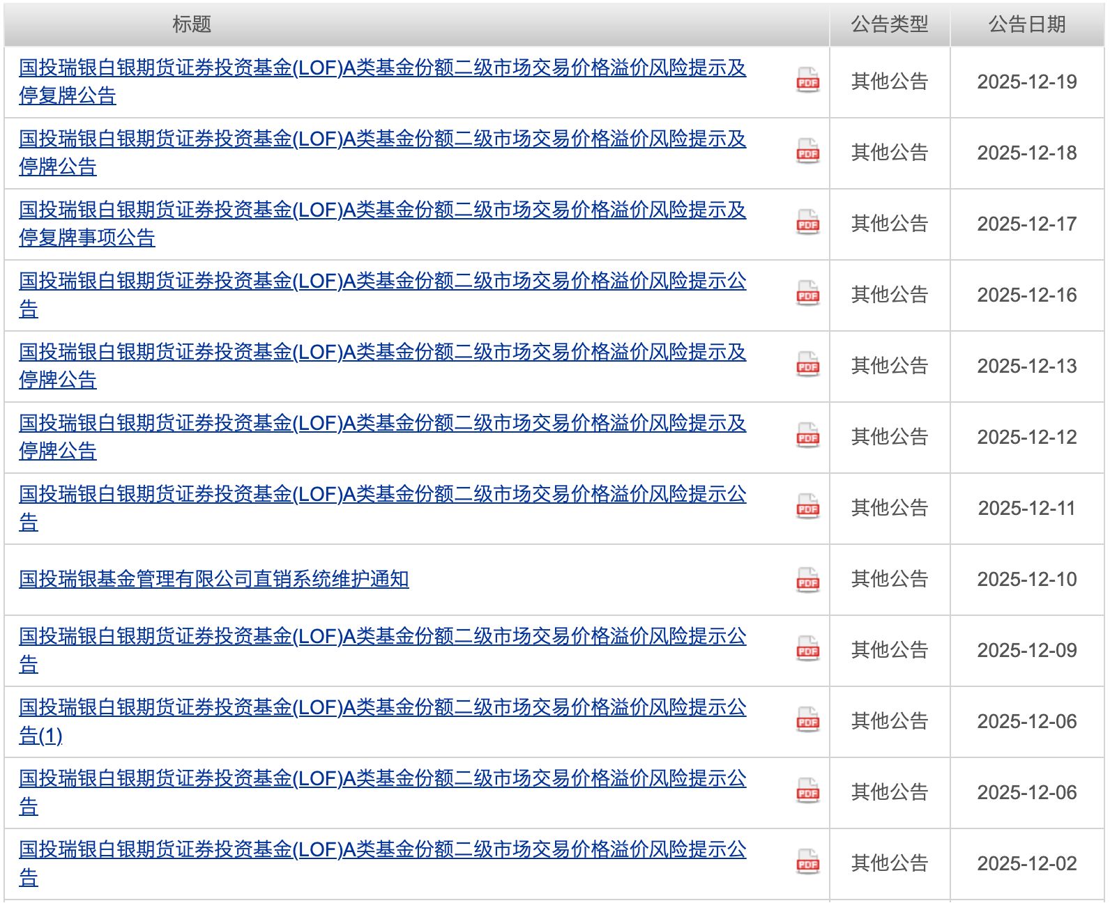每经记者|任飞 每经编辑|肖芮冬 12月18日,国投瑞银白银期货(LOF)场内再呈红盘,涨幅达到4.62%。截至收盘,升贴水率高达35.87%。 值得一提的是,12月以来,基金公司已多次提醒投资人关注该基金溢价风险。 据悉,国内投资白银的LOF品种稀缺,期货类基金的申赎波动往往也更大。由于存在高溢价,理论上的套利空间受到市场关注。不过,记者也从业内了解到,想要通过场外份额转场内进行套利交易的难度其实很大,投资者需要谨慎对待此类行为。 白银LOF再发溢价风险提示公告12月18日,国投瑞银白银期货(LOF)再次发布一则溢价风险提示公告。截至12月18日,该基金二级市场的收盘价为2.332元,明显高于基金份额净值。12月以来,该基金还连续发布了九条相关公告,多次触发盘中停牌。