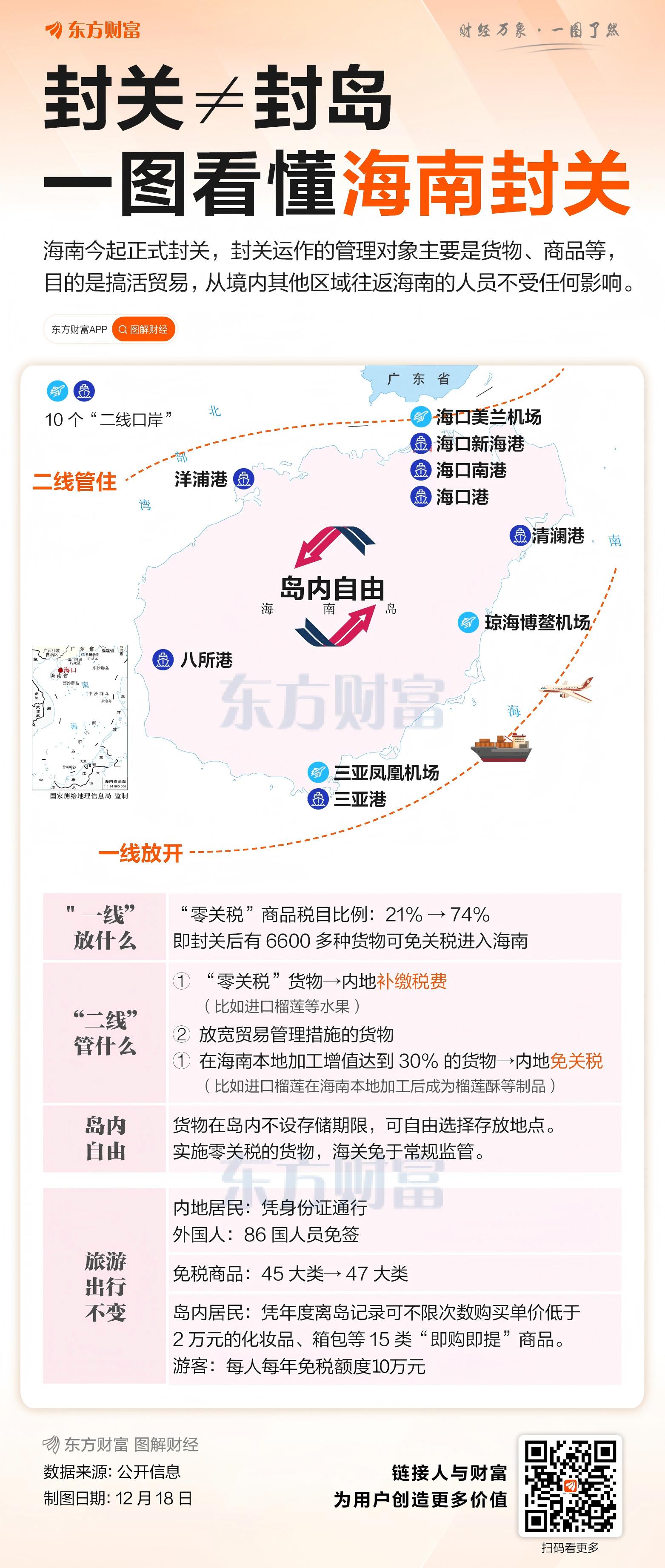 ![]() 12月18日,海南自由贸易港全岛封关运作正式启动,实施“一线放开、二线管住、岛内自由”政策,海南岛成为我国最大海关特殊监管区域。封关后零关税商品增至6600多种,覆盖74%的商品类目。 “一线”放开:将海南自贸港与我国关境外其他国家和地区之间作为“一线”,实施进口货物“零关税”、放宽贸易管理等自由化便利化措施,以岛内现有8个对外开放口岸作为“一线”口岸,对符合条件的进口货物径予放行。 “二线”管住:将海南自贸港与内地之间作为“二线”,针对“一线”放开的内容实施精准管理。 “岛内自由”:指在海南自贸港内,各类要素可以相对自由流通。 对企业而言,封关以后,进口商品“零关税”政策和调整优化的加工增值免关税规则落地实施,将大幅降低医药、高端制造等运营成本,吸引相关产业集聚,推动海上风电、商业航天等新兴产业发展。 具体来说,封关后,“一线”进口的“零关税”商品扩容至6600个税目,比例将由21%提高至74%。岛内“零关税”进口货物享惠主体之间可以免进口税收流通。全岛封关后,“零关税”政策的享惠主体范围已显著扩大,不仅包括在海南注册登记的独立法人企业和事业单位,还涵盖了经核定的科技类、教育类民办非企业单位等。 对岛内居民而言,离岛免税商品种类扩容、岛内居民购物政策优化,将激活本地消费市场,博鳌乐城“国际医疗”、陵水黎安“留学海南”等海南特色品牌将推动医疗、教育等现代服务业迎来发展热潮。 那么对离岛旅客而言,去海南出差旅行会不方便吗?在海南购物又有什么新变化? 据新民晚报消息,现阶段的封关制度设计,除部分货物从海南自贸港进入内地需要接受查验外,大多数货物以及所有的人员、物品、交通运输工具等进出海南岛,仍按现行规定管理,封关前后没有变化,人员入岛不需要办理额外的证件。 同时,海南离岛旅客免税购物政策有了调整升级,离岛免税商品范围新增宠物用品、可随身携带的乐器2类商品;扫地机器人、吸尘器、数码摄影摄像器材及配件、微型无人机等纳入免税范围;允许服装服饰、鞋帽、陶瓷制品、丝巾、咖啡、茶等国内商品,进入离岛免税店销售,退(免)增值税、消费税;离岛旅客免税购物年龄由年满16周岁调整为年满18周岁。 在旅游、酒店、会展、文化娱乐及医疗、教育等服务业方面,部分文旅、酒店已受益颇丰。据海南省统计局、文旅厅数据,2025年上半年,海南共接待游客5521.29万人次,同比增长8.1%;游客总花费1189.27亿元,同比增长8.4%;上半年入境过夜游客达65.29万人次,同比增长31.7%,文旅消费活力持续释放。
