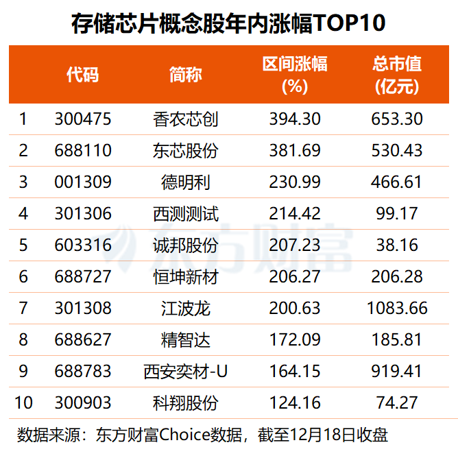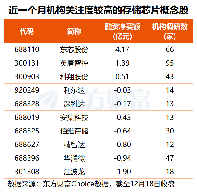 机构:存储周期或持续上行 除了华尔街,国内机构们也多数认为,存储器行业景气度有望延续至明年,并持续至2027年或更长时间。 “进入2026年,三大原厂均预计持续快速将产能升级至先进制程,积极争取北美云厂商客户AI需求,同时减少成熟制程的产能比重。”集邦咨询分析师许家源此前表示,这一策略的直接后果是DDR4等成熟存储芯片产品的供给紧缺,预计DDR4的供给紧缺将至少延续至2026年上半年。 中信证券研报指出,存储仍处于超级景气周期初期,目前未来半年缺货可见度高,合约价涨价幅度在26Q1末之前有望扩大或维持,累计涨幅追赶现货价涨幅。“乐观看待本轮结构性周期景气的持续性,预计行业供不应求至少持续至2026年底。” 华泰证券表示,AI数据中心建设持续加码、AI应用进一步深化显著拉动存储需求,且短期产能供给释放有限,看好2026年存储周期持续上行。国内存储模组、存储芯片以及主控/配套芯片等产业链上各个环节厂商均有望受益于周期上行带来的量价齐升。 “存储成为AI下半场核心变量,国产扩产迎来机遇期。”国开证券在最新研报中指出,随着AI系统瓶颈从算力向存力转移,存储产业链正迎来“摩尔定律”式的价值重估。国内存储龙头(长存、长鑫)深处扩产周期,不仅带动了产能扩张,更催化了ALD、刻蚀、TSV等核心制程设备的国产化突破,设备材料环节有望率先受益。 3只机构关注的概念股获融资客抢筹 东方财富概念板块显示,目前A股市场共有90只个股涉及存储芯片概念,合计总市值约2.48万亿元。其中,华虹公司、中微公司排名前两位,两家公司总市值均超1700亿元;另外还有3家千亿级巨头,分别是兆易创新、澜起科技、江波龙。 存储芯片板块指数今年累涨逾五成,近九成概念股实现股价上涨,平均涨幅约59.78%,更有18股翻倍式增长。其中,香农芯创年内大涨近4倍,东芯股份累涨3.81倍,德明利、西测测试、江波龙等5股年内涨幅均超200%。 业绩方面,超五成存储芯片概念股前三季度业绩向好,晶瑞电材净利同比增幅居首,深科达、长川科技、中京电子等7股净利增幅均超一倍。 ![]() 东方财富Choice数据显示,近一个月,有18只芯片概念股获得机构关注,其中11股的机构调研数在10家以上。英唐智控的机构关注度最高,近一个月共有95家机构前往调研;东芯股份位居次席,有66家机构给予关注;华润微、科翔股份、佰维存储的机构调研数分别为47家、43家和30家。 值得注意的是,上述机构高度关注的概念股中,东芯股份、英唐智控、科翔股份还获得了融资客的青睐,近一个月,这3股分别获融资净买入4.17亿元、1.39亿元和5137.38万元。 资料显示,英唐智控深耕电子元器件分销,自研芯片聚焦MEMS微振镜与车载显示芯片。公司近日在调研中表示,受行业需求影响,公司存储芯片业务同比大幅提升;代理的存储类芯片涵盖DRAM、NAND、NOR、EMMC和SSD等多种存储器件,代理品牌包括佰维、时创意、晶存、东芯、芯天下等。 东芯股份在调研交流中表示,公司目前NAND、NOR、DRAM每条产品线均设有研发团队,在研项目按预定计划正常推进中;砺算科技致力于研发多层次(可扩展)图形渲染GPU芯片,产品可实现端、云、边的主流图形渲染和AI加速。 科翔股份深耕PCB领域,公司在月初的机构调研中透露,目前公司已锚定AI这个巨大的增长赛道,计划明年根据订单情况进一步进行产线升级。公司800G光模块产品已实现批量生产,并接到中批量订单,1.6T光模块正在研发中。此外,公司正与某北美大厂合作研发可用于AI服务器的陶瓷板。 ![]()