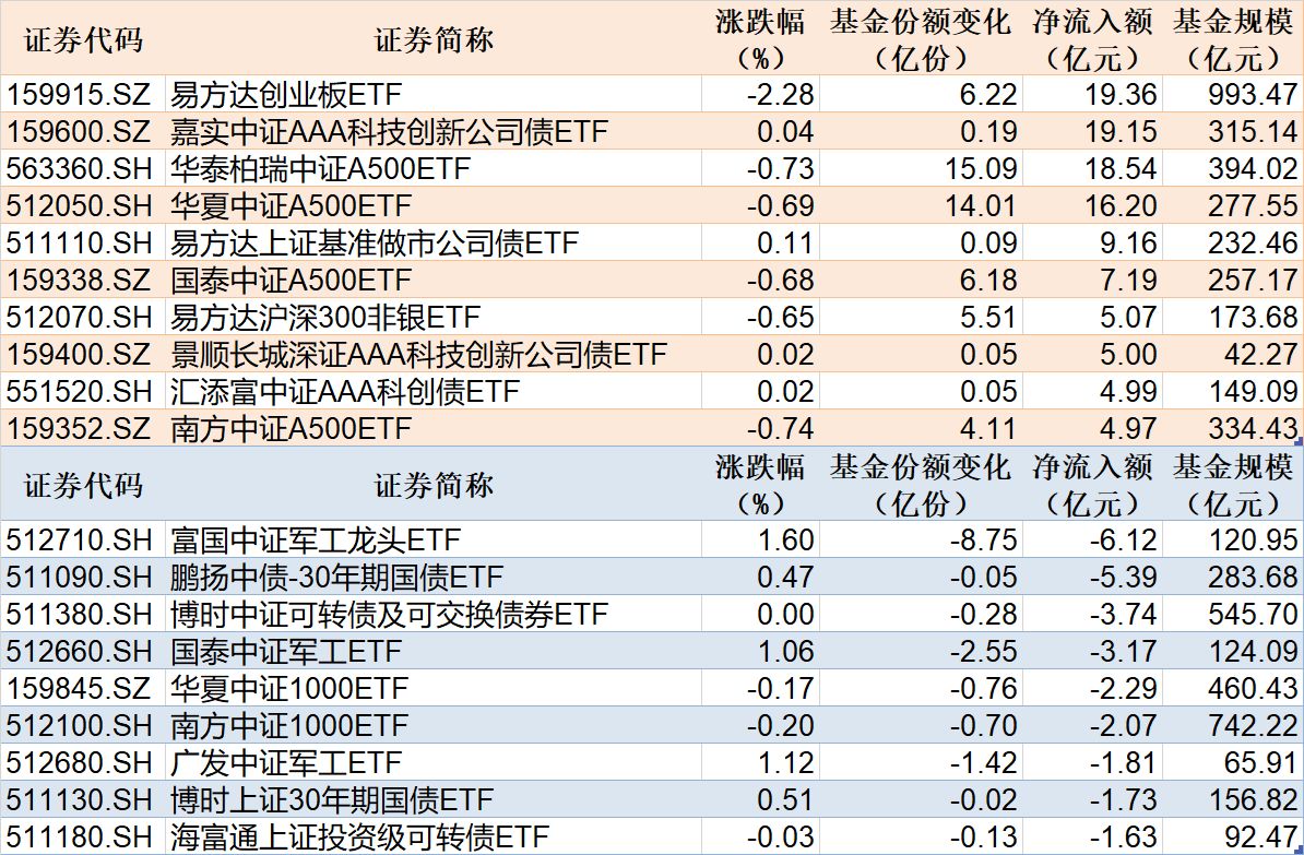 每经记者|叶峰 每经编辑|彭水萍 昨日三大指数涨跌不一,沪指低开回升,创业板指低开低走跌超2%。从板块来看,银行板块震荡拉升,商业航天概念走势活跃,医药商业延续强势;下跌方面,锂电池板块回落。 Wind数据显示,在12月18日的非货币ETF市场中,易方达创业板ETF基金份额增加6.22亿份,净流入额19.36亿元;嘉实中证AAA科技创新公司债ETF份额增加0.19亿份,净流入额19.15亿元;华泰柏瑞中证A500ETF份额增加15.09亿份,净流入额18.54亿元。