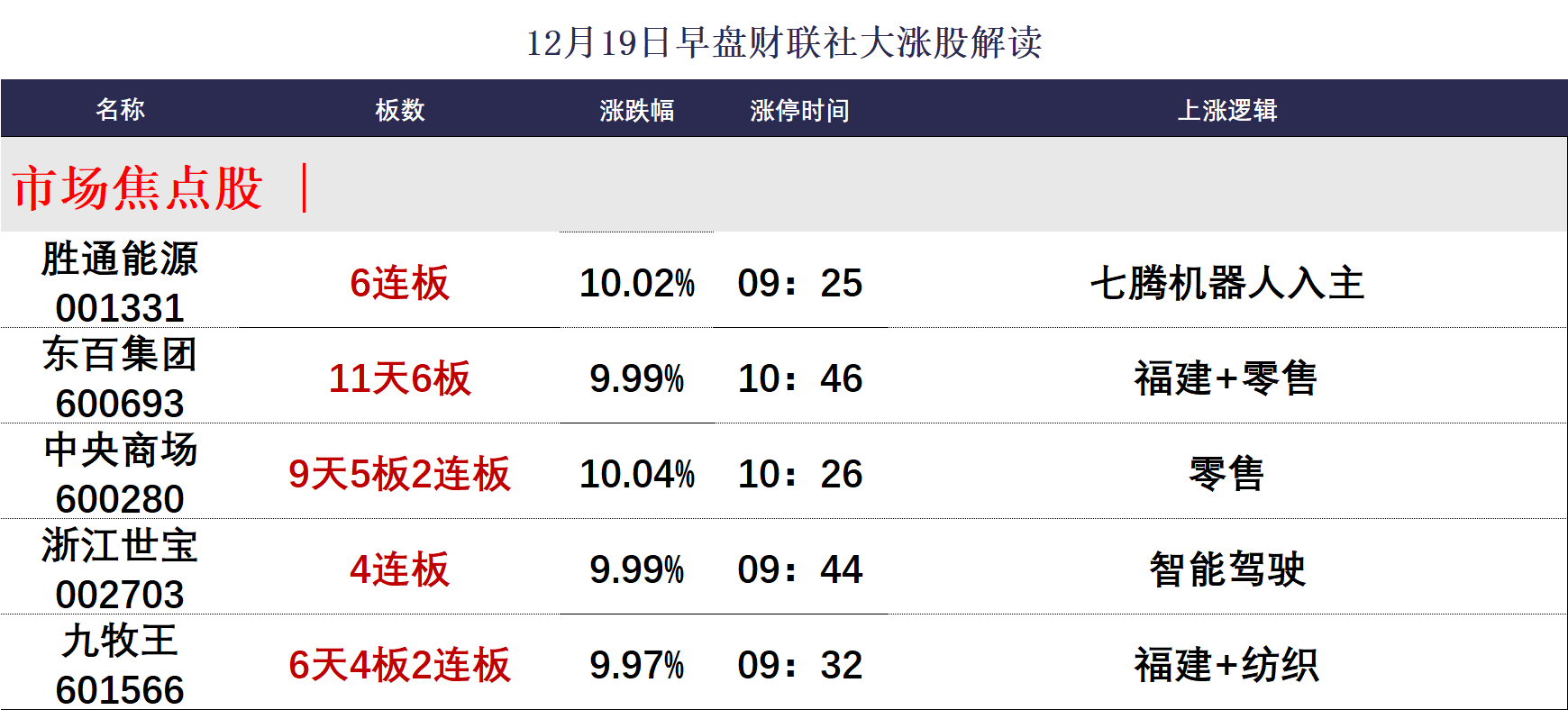 今日午盘全市场共49股涨停,连板股总数12只,20股封板未遂,封板率为71%(不含ST股、退市股)。焦点股方面,胜通能源晋级6连板;大消费板块反复活跃,东百集团11天6板、中央商场9天5板、九牧王6天4板;智能驾驶概念股浙江世宝走出4连板。