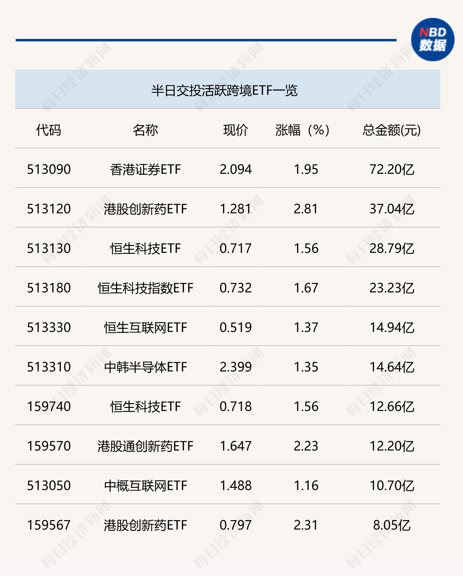 每经记者|刘明涛 每经编辑|叶峰 今日上午,香港证券ETF(513090)再度放量,半日成交金额高达72.2亿元,港股创新药ETF(513120)成交金额也出现大幅放量,半日成交金额达37.04亿元。行业、主题ETF方面,只有科创芯片ETF(588200)和证券ETF(512880)半日成交金额超过10亿元,整体交投中规中矩。