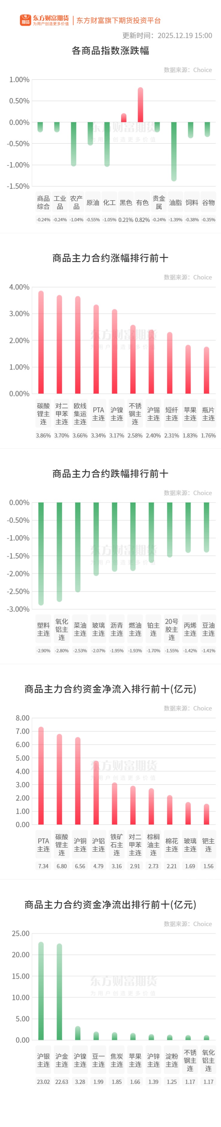 行情纵览![]() 宏观产经每日经济新闻:12月19日,日本央行将政策利率上调0.25个百分点至0.75%,创下自1995年9月以来的最高水平,正式宣告了超宽松货币政策时代走向终结。这一决策标志着日本货币政策的重大转向,旨在打破长期低利率、低通胀、低增长的循环。 新华财经:19日,中国物流与采购联合会在2025大宗商品国际化发展大会上发布《中国大宗商品价格指数报告(2025)》。报告显示,总体看2025年中国大宗商品价格指数呈现前低后高、企稳回升态势,表明我国的经济结构正朝着更健康、更可持续的方向优化。 中国人民银行:央行今日开展562亿元7天逆回购操作,操作利率为1.40%,与此前持平。同时,以固定数量、利率招标、多重价位中标方式开展了1000亿元14天期逆回购操作。 品种资讯黑色系期货 钢材:随着宏观利好消息逐步消化,钢市将由“基本面”主导。季节性因素叠加国内投资增速放缓,钢材需求疲弱格局难改。由于钢厂检修减产数量增加,淡季库存继续下降,供需大体处于弱平衡。原燃料价格止跌反弹过后,或不具备持续上涨条件。短期来看,钢价或窄幅震荡运行,涨跌空间均不大。(我的钢铁网) 焦煤:12月19日蒙古国ETT公司炼焦煤进行线上竞拍,1/3焦原煤A9,V28-37,S1.0,G75,Mt5起拍价96.4美元/吨,较上期12日下跌1美元/吨,挂牌数量6.4万吨全部流拍,以上价格均不含税。供货地点为甘其毛都口岸海关监管区,供货时间为付款后103天内,最后供应日期为2026年4月1日。 12月19日蒙古国ETT公司炼焦煤进行线上竞拍,蒙5#精煤A10.5、V28.0、S0.85、Mt10.0、G80起拍价124.2美元/吨,较上期10月6日下跌39.4美元/吨,挂牌数量12.8万吨全部底价成交,较上期下跌41.4美元/吨,以上价格均不含税。供货地点为甘其毛都口岸监管区,供货周期为付款后118天,最后供应日期为2026年4月16日。(我的钢铁网) 硅铁:硅铁厂家整体盈利表现不佳,部分厂家选择转产或减产来止损,近期产量下滑幅度较为明显。本周Mysteel统计全国136家独立硅铁企业样本开工率为30.3%,环比上周减少2.14%;日均产量为14250吨,环比上周减少6.13%、930吨,处近5个月来最低水平。(我的钢铁网) 农产品期货 大豆:12月19日进口大豆竞价交易结果:国家粮食交易中心计划拍卖550143.732万吨,年份22、23年,分布在山东、河南、浙江、安徽、辽宁、河北、四川、湖南,实际成交179701.674吨,底价3660/3710/3730/3740/3760/3800/3840元/吨,成交均价3750.83元/吨,成交比例32.66%,交货日期2026年1月5日-2026年5月31日。(我的钢铁网) 棉花:据Mysteel调研显示,截止到12月18日,国内进口棉主要港口库存周环比增加0.41%,至39.19万吨。其中,山东青岛、济南港口及周边仓32.9万吨,同比减少20.57%;江苏张家港港口及周边仓库进口棉库存约3.37万吨;其他港口库存约2.92万吨。(我的钢铁网) 生猪:据农业农村部监测,截至12月19日14:00时,全国农产品批发市场猪肉平均价格为17.53元/公斤,较前一日上升0.1%;鸡蛋平均价格为7.45元/公斤,较前一日上升0.5%。(新华财经) 有色/贵金属期货 沪铜:高盛重申其2035年铜价将达15,000美元的预测,并继续建议采取做多铜、做空铝的交易策略;在其基准情景下,2026年铜价将企稳,均价将达每吨11,400美元。(财联社) 碳酸锂:宁德时宜春枧下窝锂矿复产又有新的进展。12月19日,江西省宜春招标网发布《江西省宜丰县圳口里-奉新县枧下窝锂矿采矿项目环境影响评价第一次环评信息公示》,对宜春时代新能源矿业有限公司的江西省宜丰县圳口里-奉新县枧下窝锂矿采矿项目进行第一次环评信息公示。北京市京师律师事务所矿产资源法律事务部主任曹旭升表示,这是众多办证流程中的正常审批环节之一。据曹旭升介绍,此次环评公示流程结束后,宁德时代枧下窝锂矿复产还需要取得不同部门的许可,还需开展一系列工作,直至取得《安全生产许可证》,才会允许正常开采。(期货日报) 沪铅:冬季雾霾天气多发,环保管控对再生铅炼厂的产量存有潜在限制;叠加电动车用废旧铅酸蓄电池报废量转淡,原料供应压力亦是影响再生铅开工率的主要因素。(SMM) 能化期货 烧碱:今日,山东液碱局部价格稳定,个别企业因自身出货情况价格小幅调整。鲁西南32%离子膜碱主流成交670-720;鲁中东部32%离子膜碱主流成交695-750,50%离子膜碱主流成交1110-1200;鲁北32%离子膜碱主流成交720-770;鲁南32%离子膜碱主流成交720-730。(单位:元/吨)(隆众资讯) 本周烧碱样本企业产能平均利用率为84.7%,较上周环比-1.5%。分区域来看,华北有前期负荷不满装置提负,负荷小幅上升,华北+0.3%至82.4%,其中山东-0.1%至92.9%。华东、西南、华中、华南负荷下滑,华东、华南地区存在企业检修,负荷下滑明显,华东-6.0%至71.9%,西南-5.3%至79.0%,华南-4.6%至84.5%,华中-0.8%至81.9%。其它大区基本稳定。(隆众资讯) 甲醇:江苏太仓甲醇早盘市场基差暂稳。早间开盘太仓现货商谈2140-2150元/吨,基差参考+23~+25元/吨;12下基差商谈01+18~+23元/吨;1下+48~+52元/吨。(隆众资讯) 晚间关注21:30 美国:年化实际GDP:非季调:终值 (文章来源:丁冬财经研究中心) |